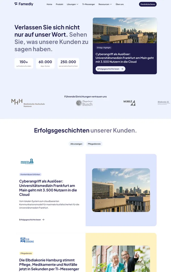 Famedly предлагает 100% безопасное и быстрое решение для коммуникации в сфере здравоохранения, соответствующее требованиям DSGVO. Их мессенджер обеспечивает эффективное взаимодействие как внутри организаций, так и между ними.