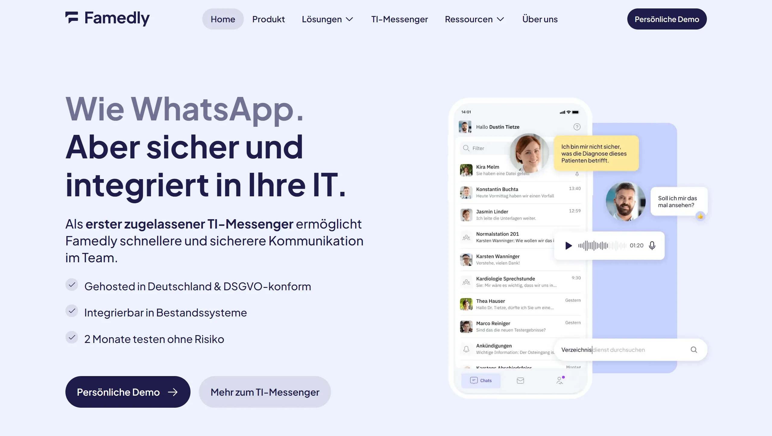 Famedly предлагает безопасное и быструю коммуникацию для медицинских учреждений, гарантируя полное соответствие стандартам DSGVO. Их решения включают коммуникационные платформы для клиник, больниц и служб поддержки, способствующих эффективной командной работе.