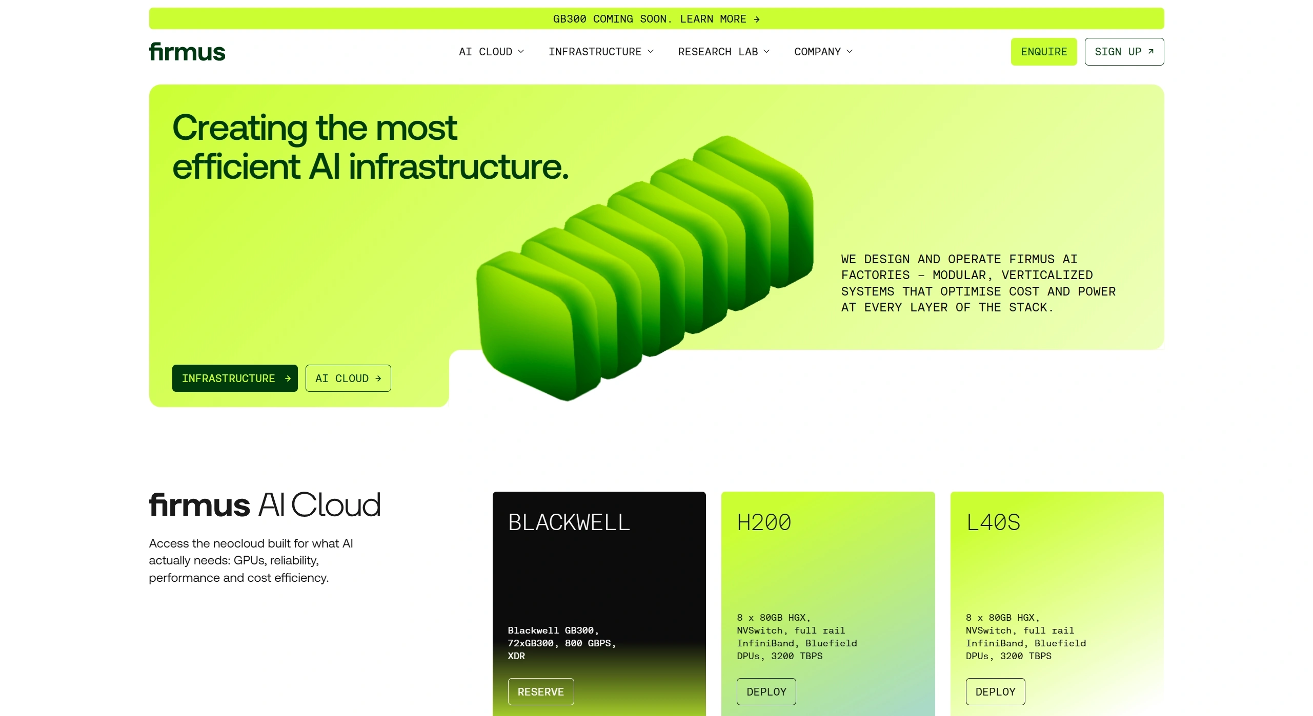We design and operate Firmus Cloud and AI Factories — sovereign, modular systems that optimise cost and power at every layer of the stack. The company focuses on creating efficient AI infrastructure.