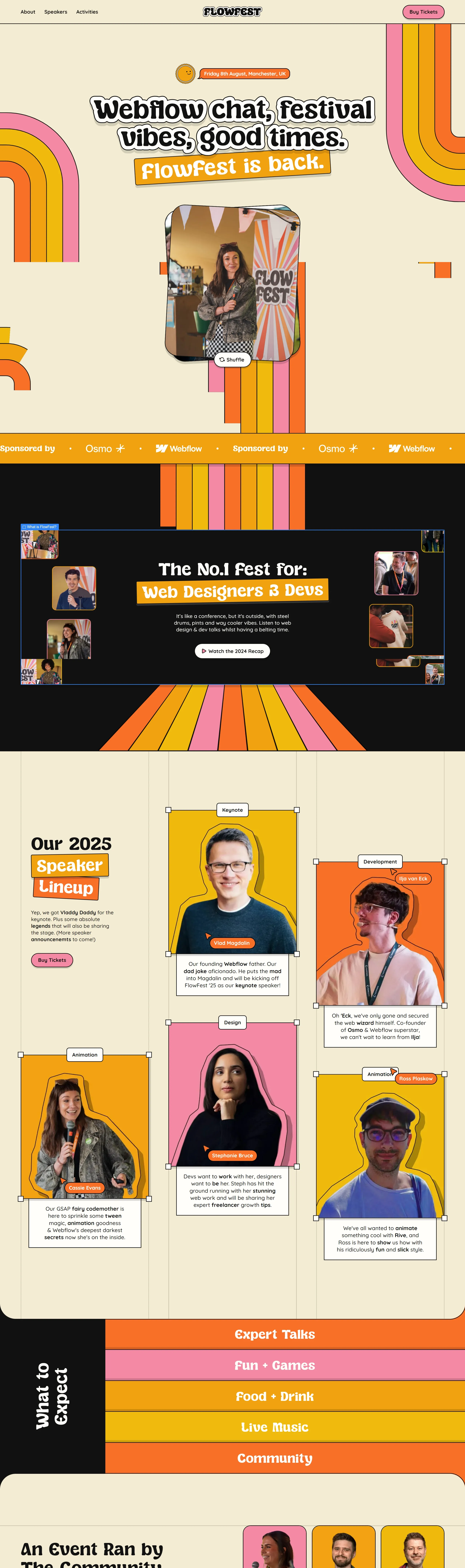 FlowFest — это фестиваль для веб-дизайнеров и разработчиков, который объединяет элементы конференции и уличного праздника с расслабленной атмосферой, живой музыкой и увлекательными выступлениями. Мероприятие обещает крутые взаимодействия с участниками и известными спикерами.