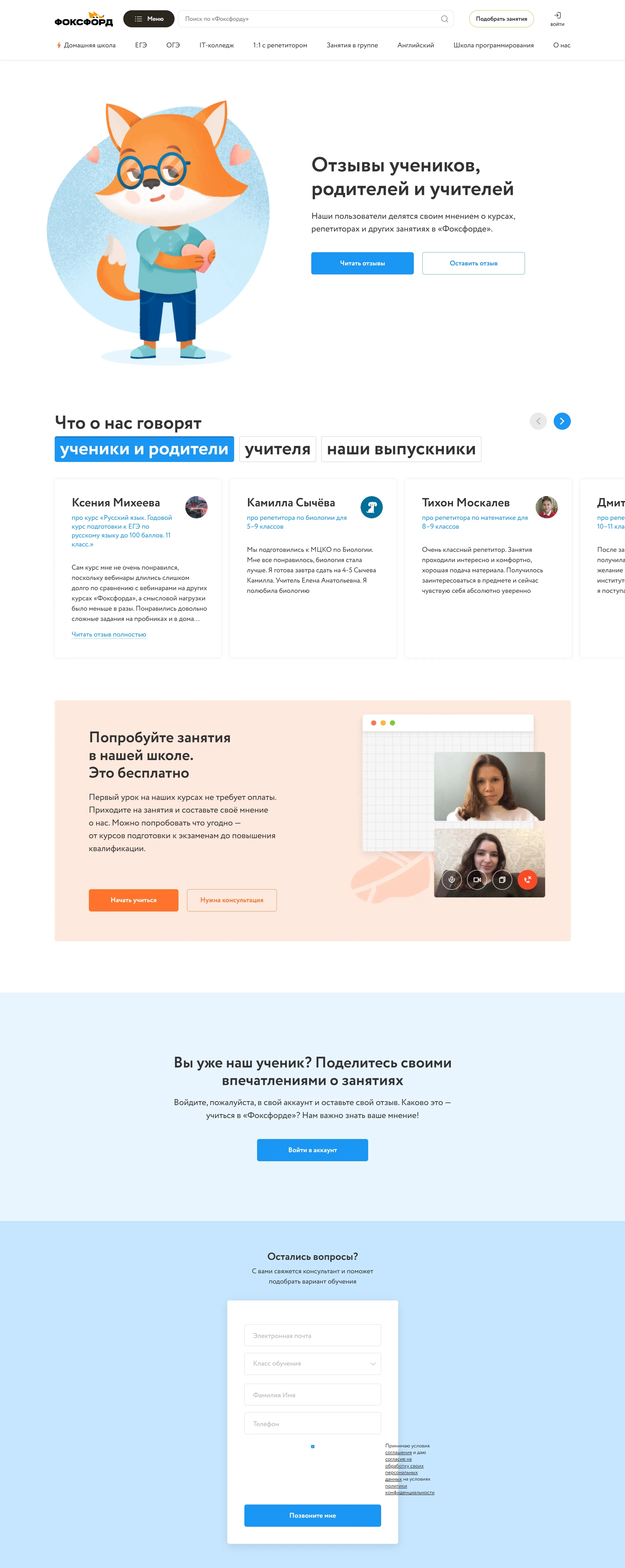 Отзывы Фоксфорд, тематика — Образование, цвета — Белый, стиль — Корпоративный, типографика — Без засечек