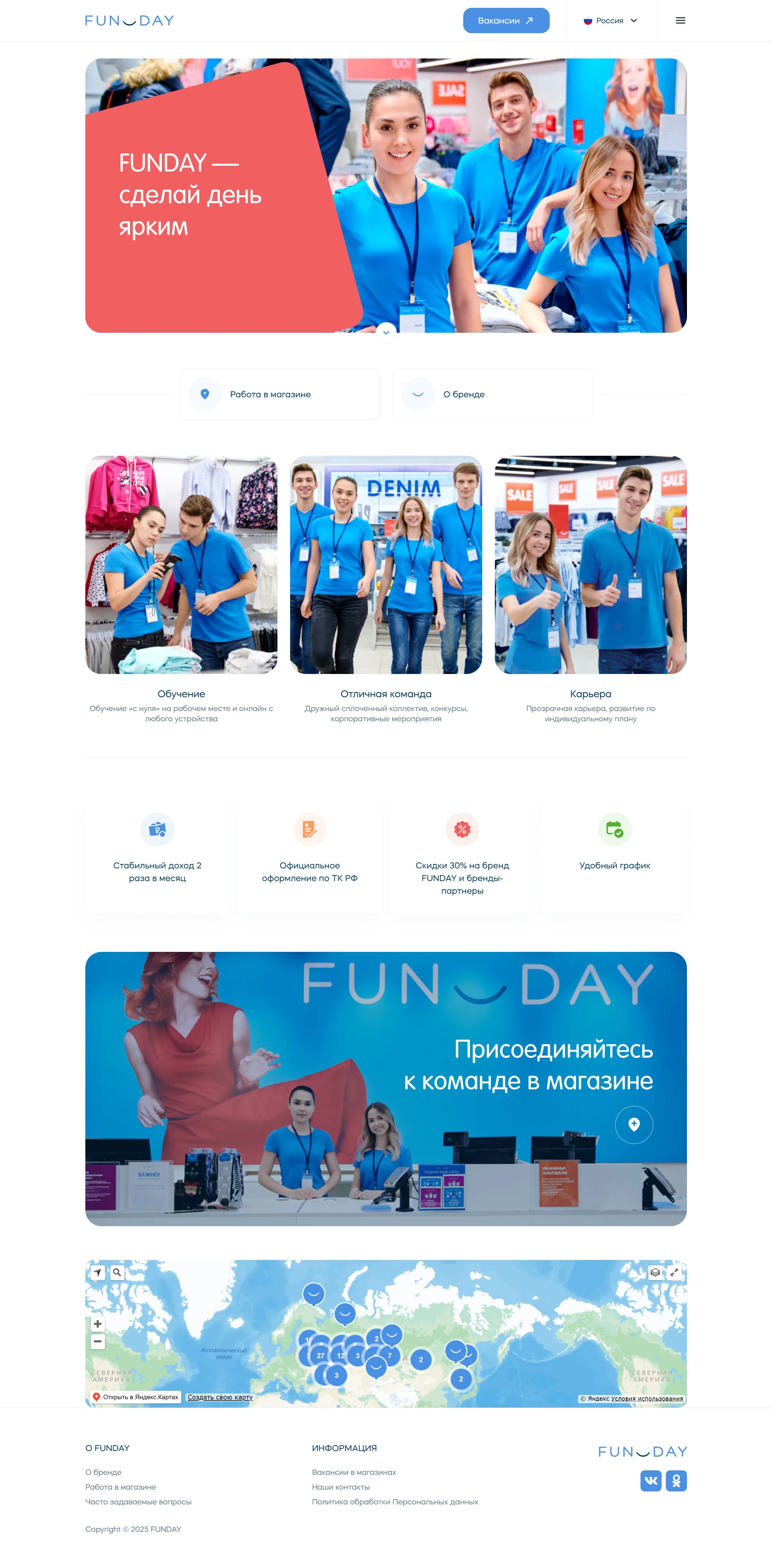 Страница карьеры Fundayshop, тематика — Розничная торговля, цвета — Белый, Серый, Синий, стиль — Корпоративный, типографика — Без засечек