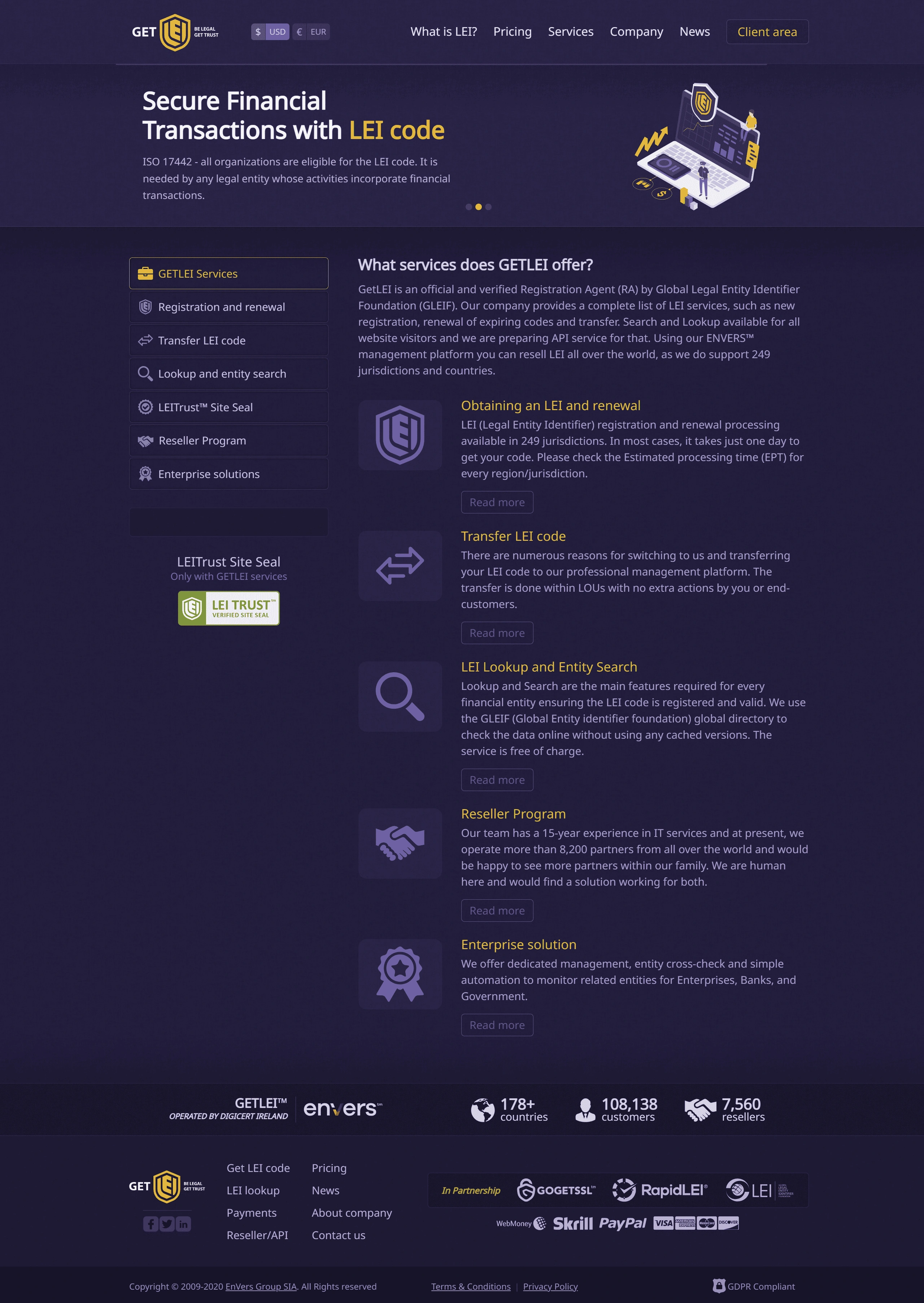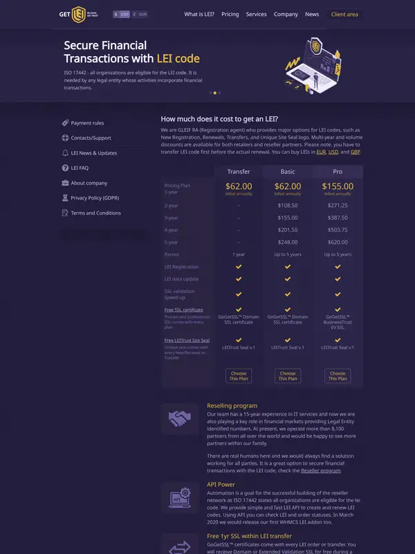 The company specializes in registering, renewing, and transferring LEI codes, offering over 15 years of experience in the field. They provide various services including a partner program and LEI lookup services.