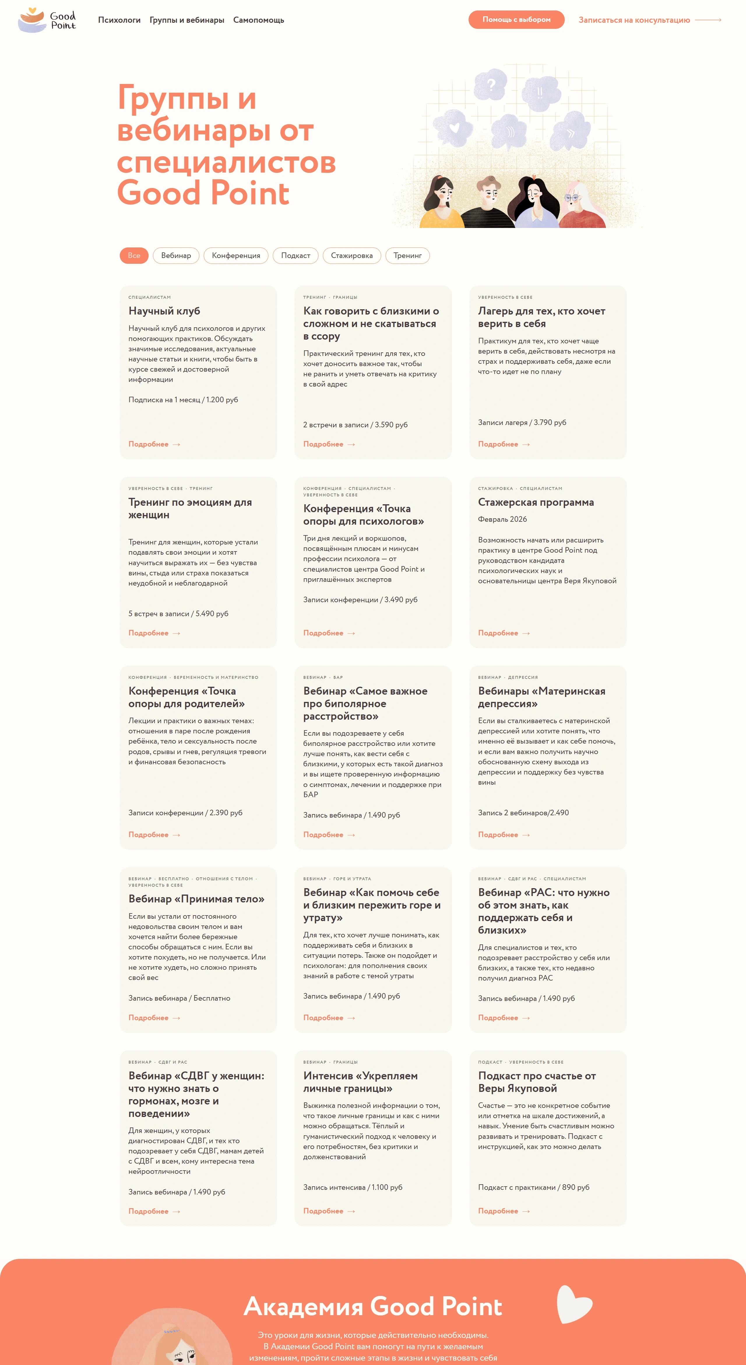 Секция «Первый экран» с сайта https://good-point.ru/, тематика — Психология, цвета — Белый, Серый, стиль — Рисованный, Минимализм, типографика — Без засечек