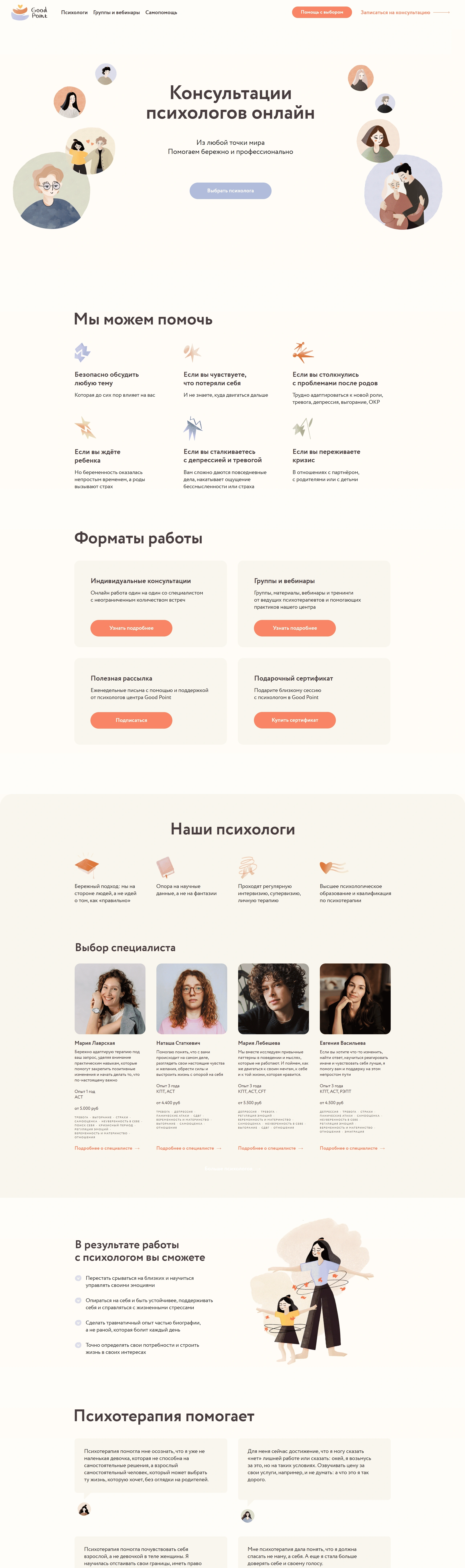 Главная Good Point, тематика — Психология, цвета — Белый, стиль — Рисованный, Карточный, Минимализм, типографика — Без засечек, Декоративные