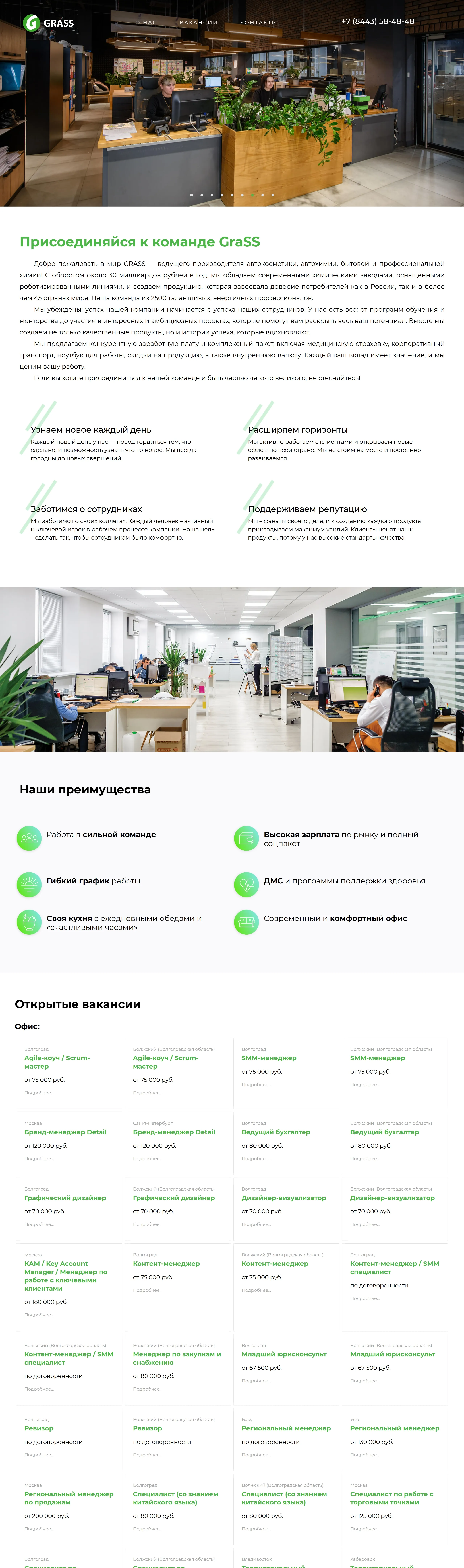 Страница карьеры GRASS, тематика — Производство, цвета — Белый, стиль — Корпоративный, типографика — Без засечек