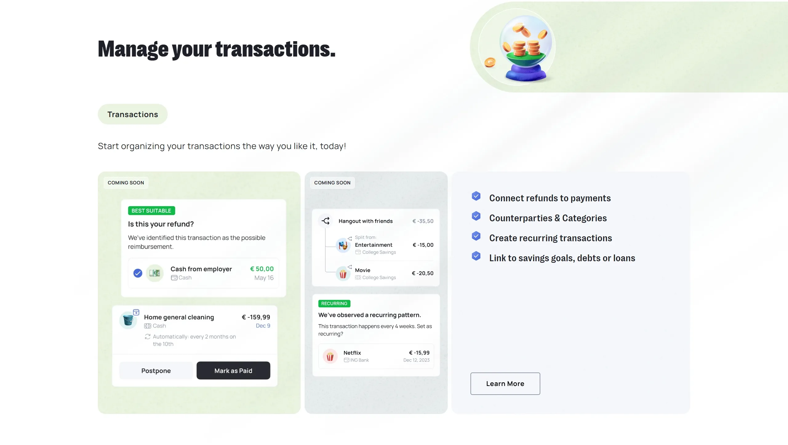 Grassfeld предлагает управлять личными финансами с помощью мобильного приложения, обеспечивая ясность и спокойствие в финансовых делах. Платформа включает в себя инструменты для контроля бюджета, анализа транзакций и хранения документов.