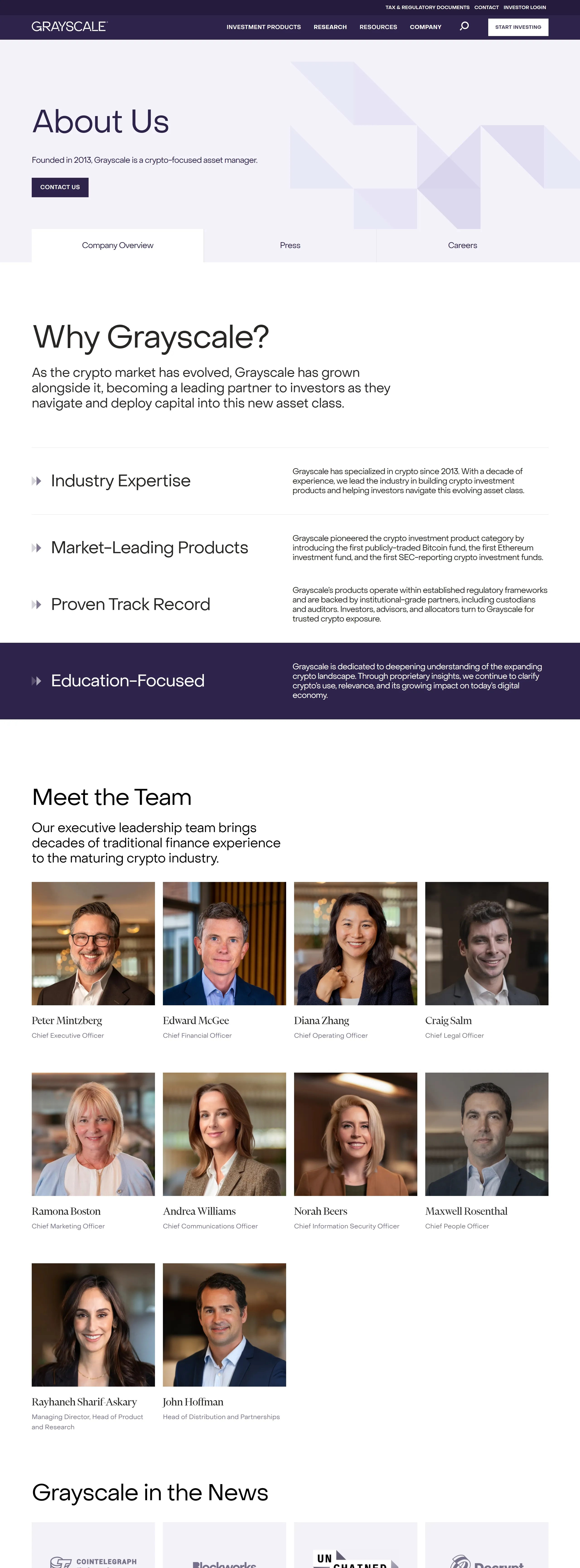 Страница о компании Grayscale, тематика — Крипто  и блокчейн, цвета — Белый, Серый, стиль — Корпоративный, Минимализм, типографика — Без засечек