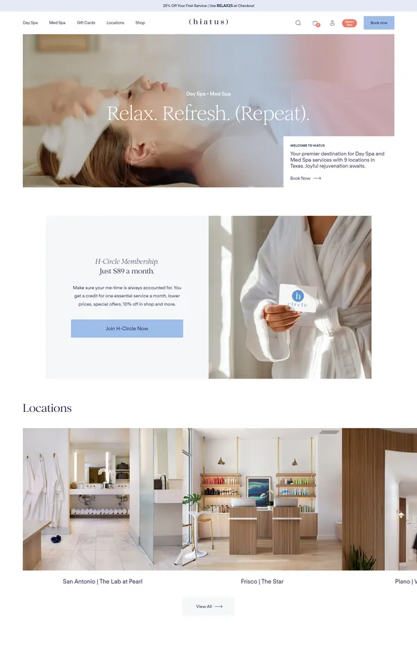 Это награжденный дневной и медицинский спа-салон в Техасе, предлагающий широкий спектр массажей, уходов за лицом и телом, а также услуги по омоложению и маникюру в высокой степени обслуживания. С девятью локациями по всему штату, Hiatus предоставляет доступные и эффективные спа-процедуры, помогая клиентам расслабиться и восстановить силы.