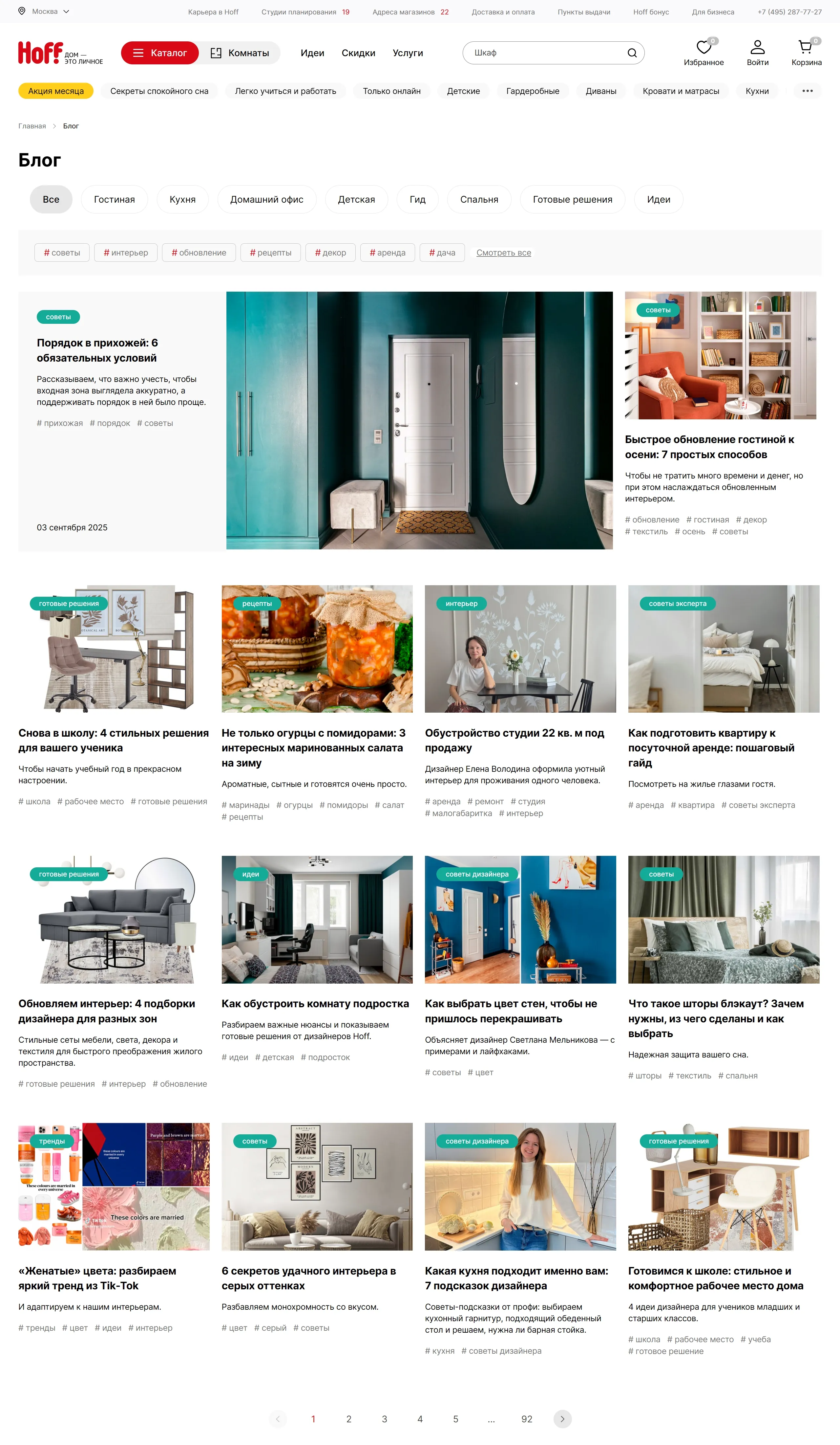 Секция «Блог» с сайта https://hoff.ru/, тематика — Интернет-магазин, цвета — Белый, Серый, стиль — Корпоративный, типографика — Без засечек