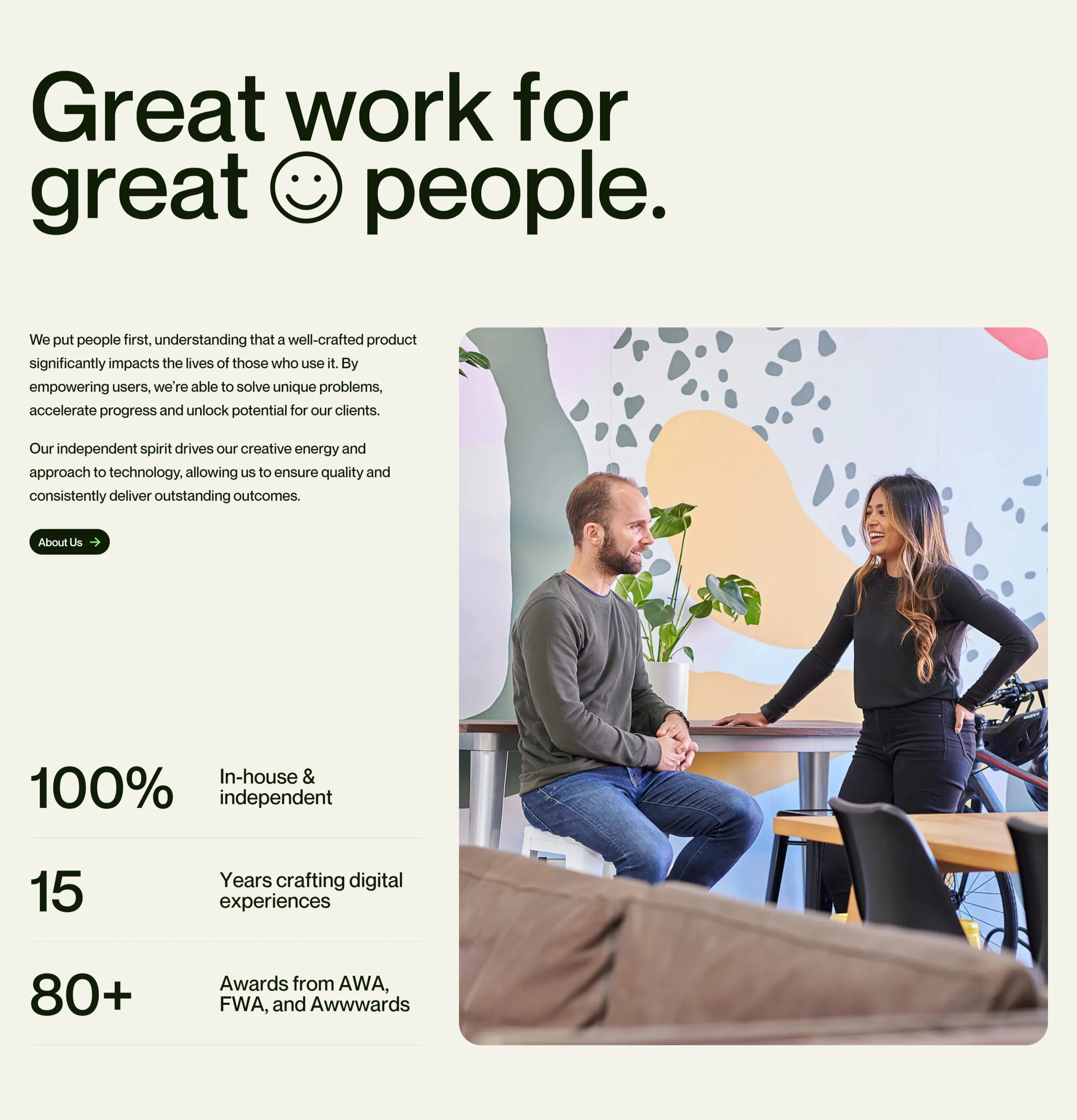 Это награждённое агентство дизайна и технологий, которое создаёт веб-сайты, приложения и цифровые продукты для современных брендов. Они ставят людей на первое место, понимая, как хорошо разработанный продукт может повлиять на жизнь пользователей.