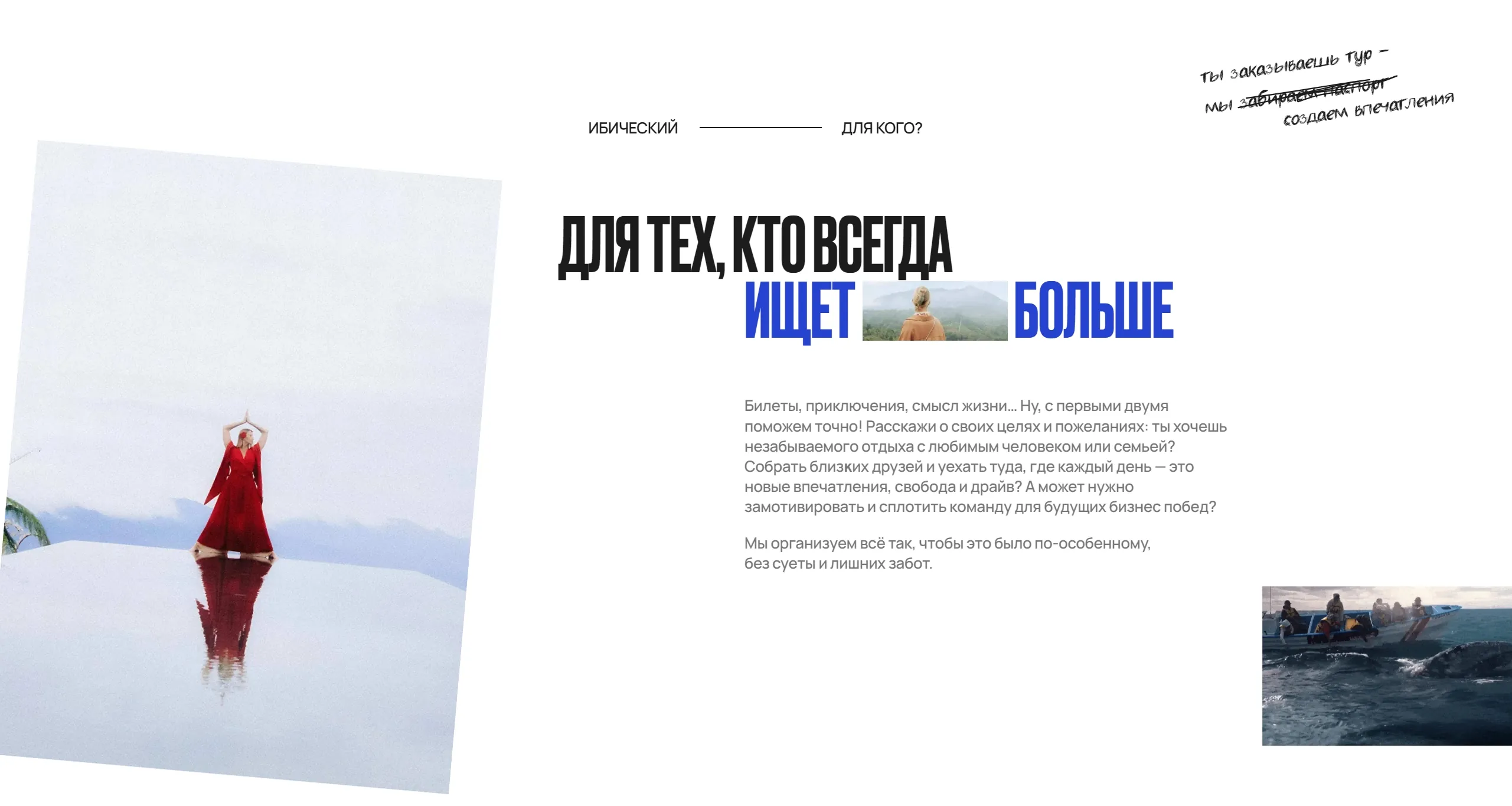 Компания предлагает индивидуальные путешествия и туры, создавая авторские маршруты, которые учитывают пожелания и интересы клиентов. Основной фокус сделан на высоком уровне заботы и вдохновляющей атмосфере приключений.