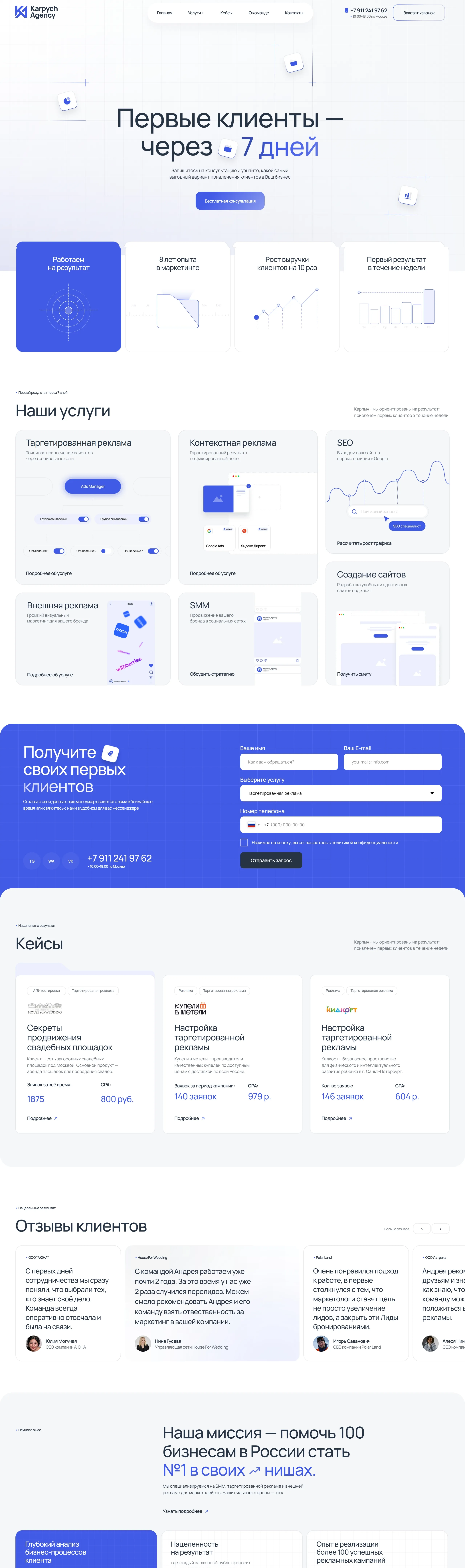 Маркетинговое агентство с 8-летним опытом, специализирующееся на привлечении клиентов через таргетированную и контекстную рекламу, а также внешнюю рекламу. Агентство гарантирует результаты в виде роста выручки и первых клиентов в течение недели.