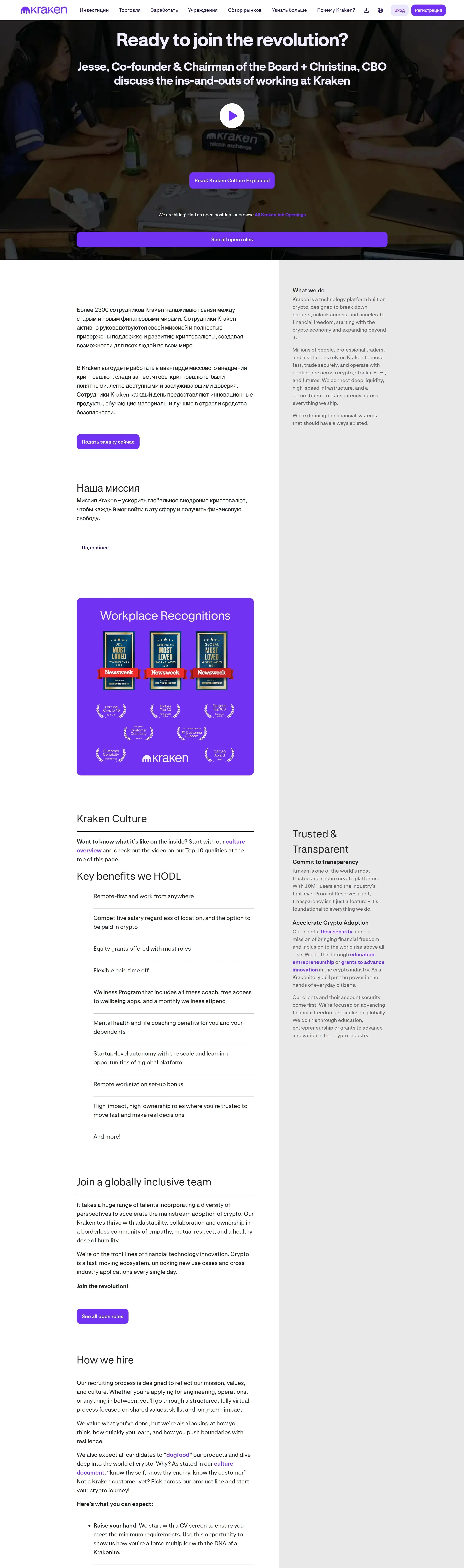 Страница карьеры Kraken, тематика — Крипто  и блокчейн, цвета — Белый, Черный, стиль — Корпоративный, типографика — Без засечек