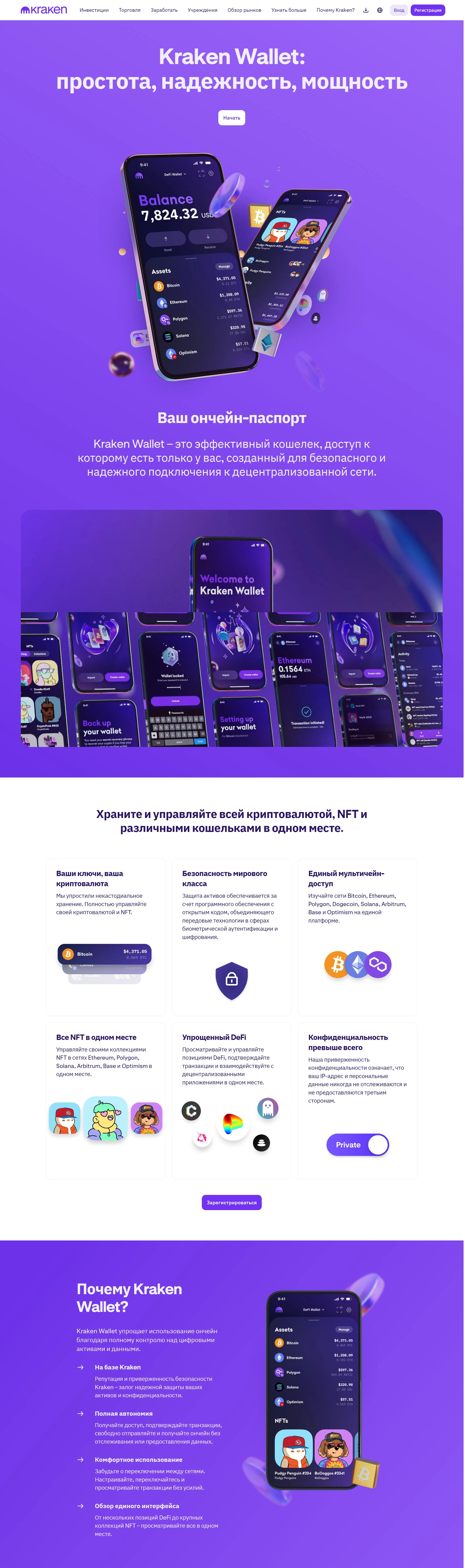 Продукт Kraken, тематика — Крипто  и блокчейн, цвета — Белый, Черный, Фиолетовый, стиль — Фестивальный, Полигональный, типографика — Без засечек