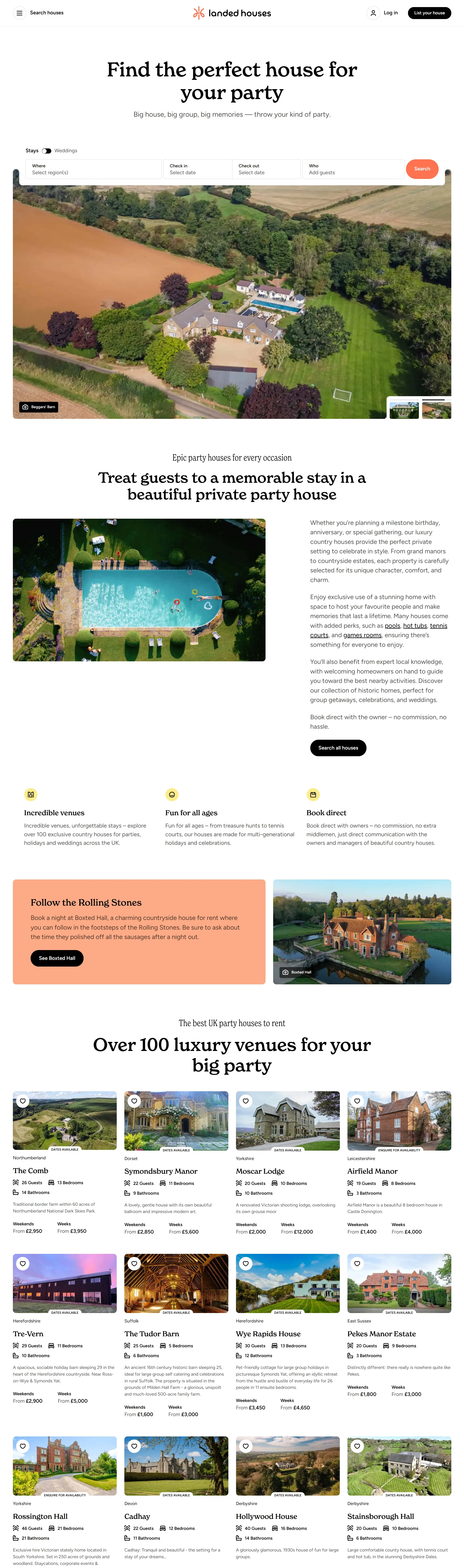 Премиальная коллекция из более чем 125 больших загородных домов для аренды в Великобритании, идеально подходящая для праздников, вечеринок и свадеб. Клиенты могут забронировать напрямую у владельцев без дополнительных сборов.