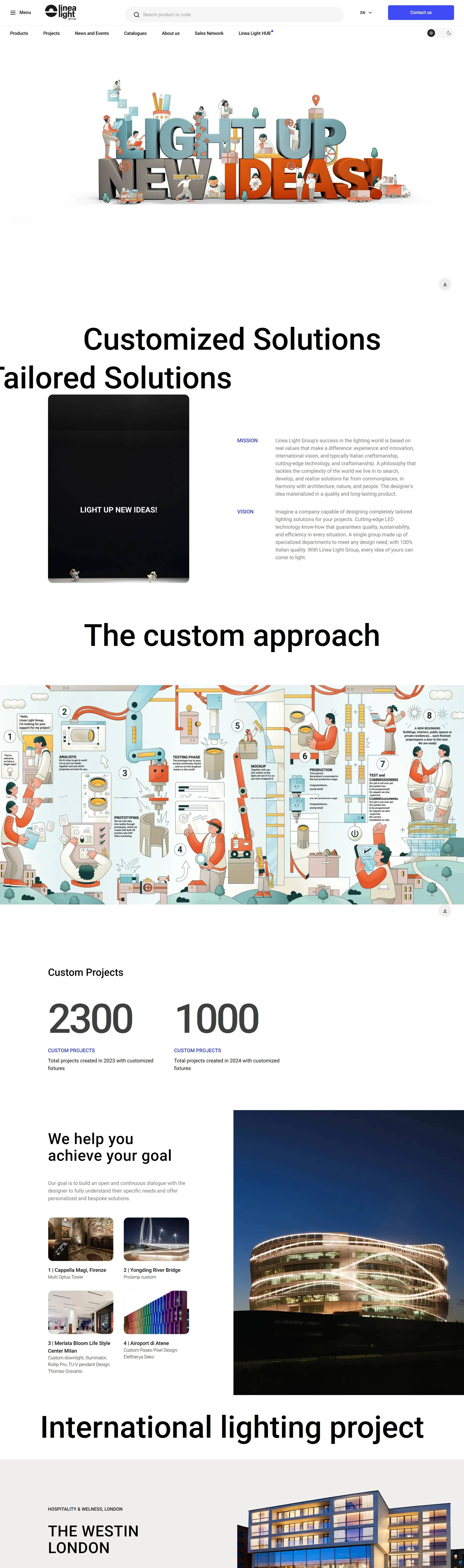 Страница о компании Linea Light, тематика — Производство, цвета — Белый, Черный, Серый, стиль — Корпоративный, типографика — Без засечек