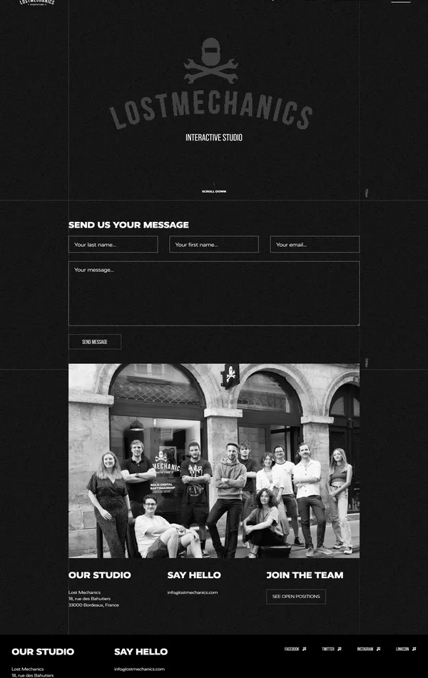 Контакты Lostmechanics, тематика — Дизайн, Агентство , цвета — Черный, Серый, стиль — Корпоративный, Минимализм, типографика — Без засечек