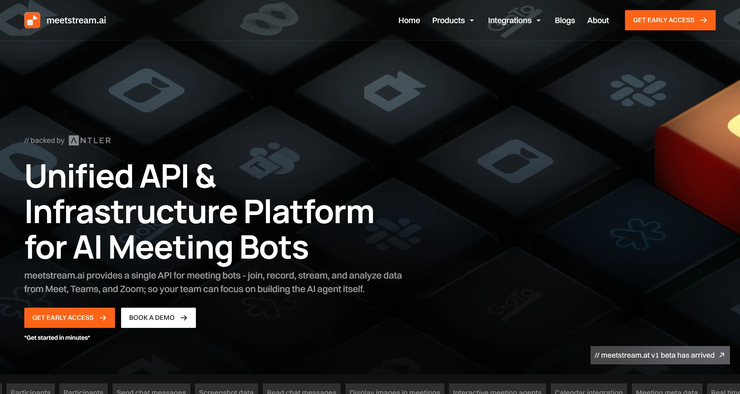 Платформа API и инфраструктуры для создания интеллектуальных ботов для встреч, которая позволяет захватывать аудио, видео, чат и транскрипты в реальном времени. Она предлагает единый API для интеграции с популярными платформами, такими как Meet, Teams и Zoom.
