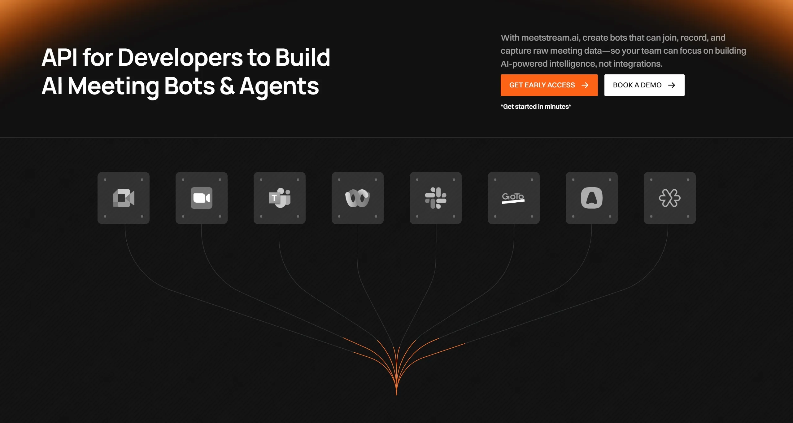 Платформа предоставляет единый API для создания интеллектуальных ботов для встреч, позволяя пользователям захватывать аудио, видео и транскрипты в реальном времени из различных платформ, таких как Meet, Teams и Zoom.