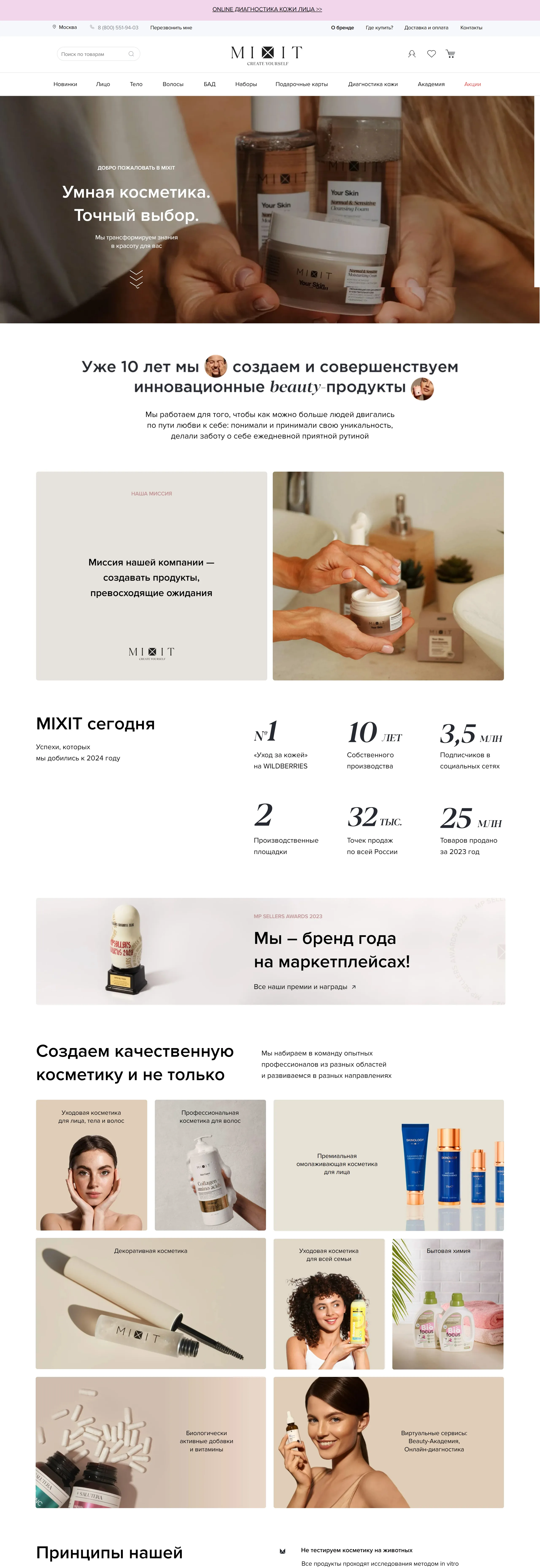 Страница о компании Mixit, тематика — Красота, цвета — Белый, Серый, стиль — Корпоративный, типографика — Без засечек
