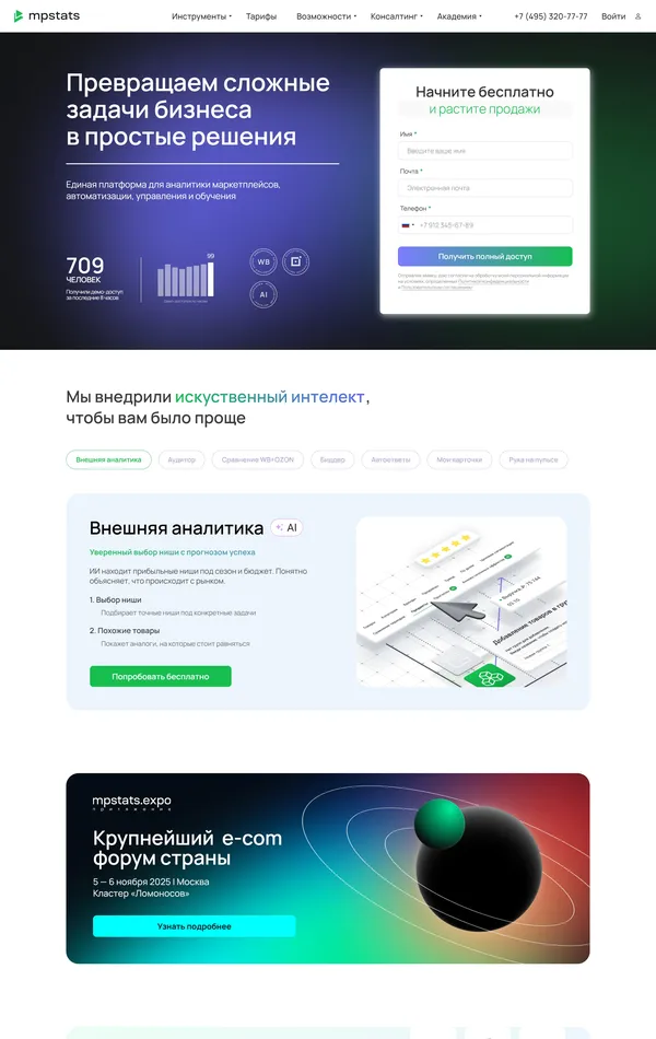 Продукт MPSTATS, тематика — SaaS, цвета — Белый, Черный, стиль — Корпоративный, типографика — Без засечек