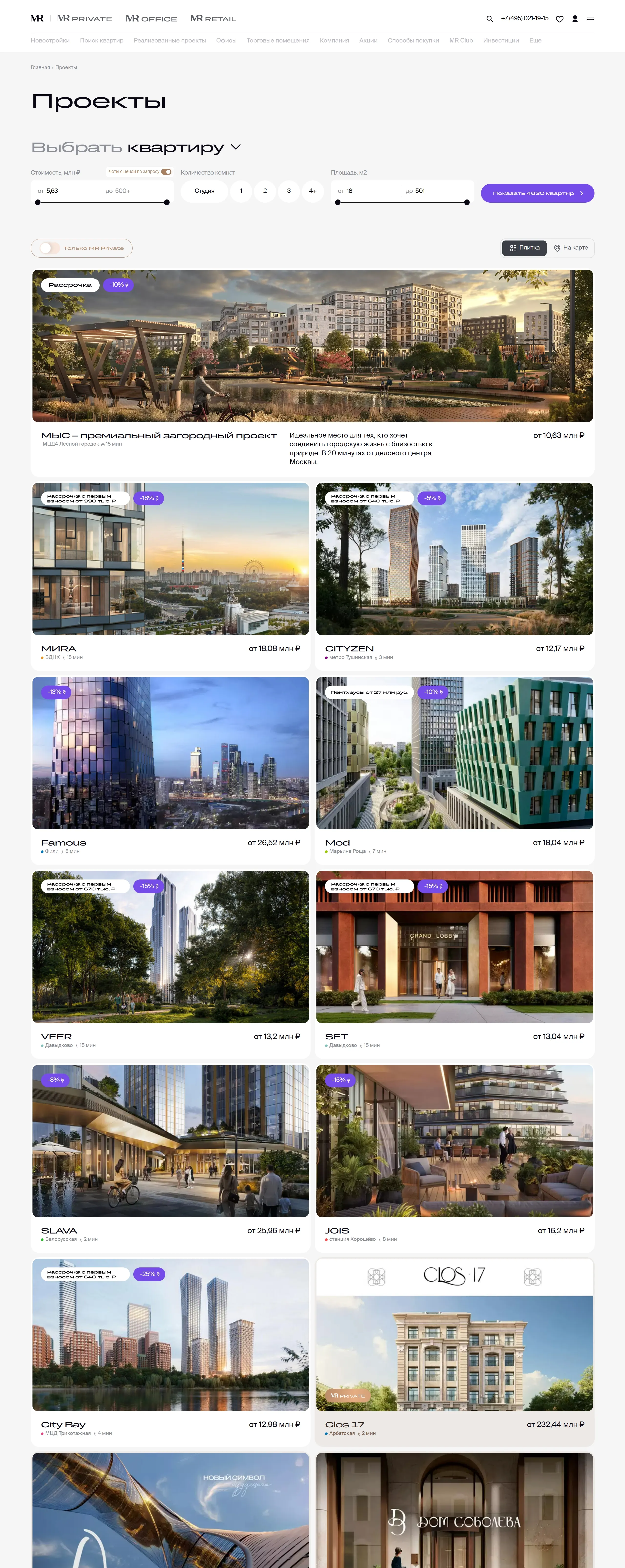 Секция «Первый экран» с сайта https://www.mr-group.ru/, тематика — Строительство, Недвижимость, цвета — Белый, Черный, Серый, стиль — Корпоративный, типографика — Без засечек