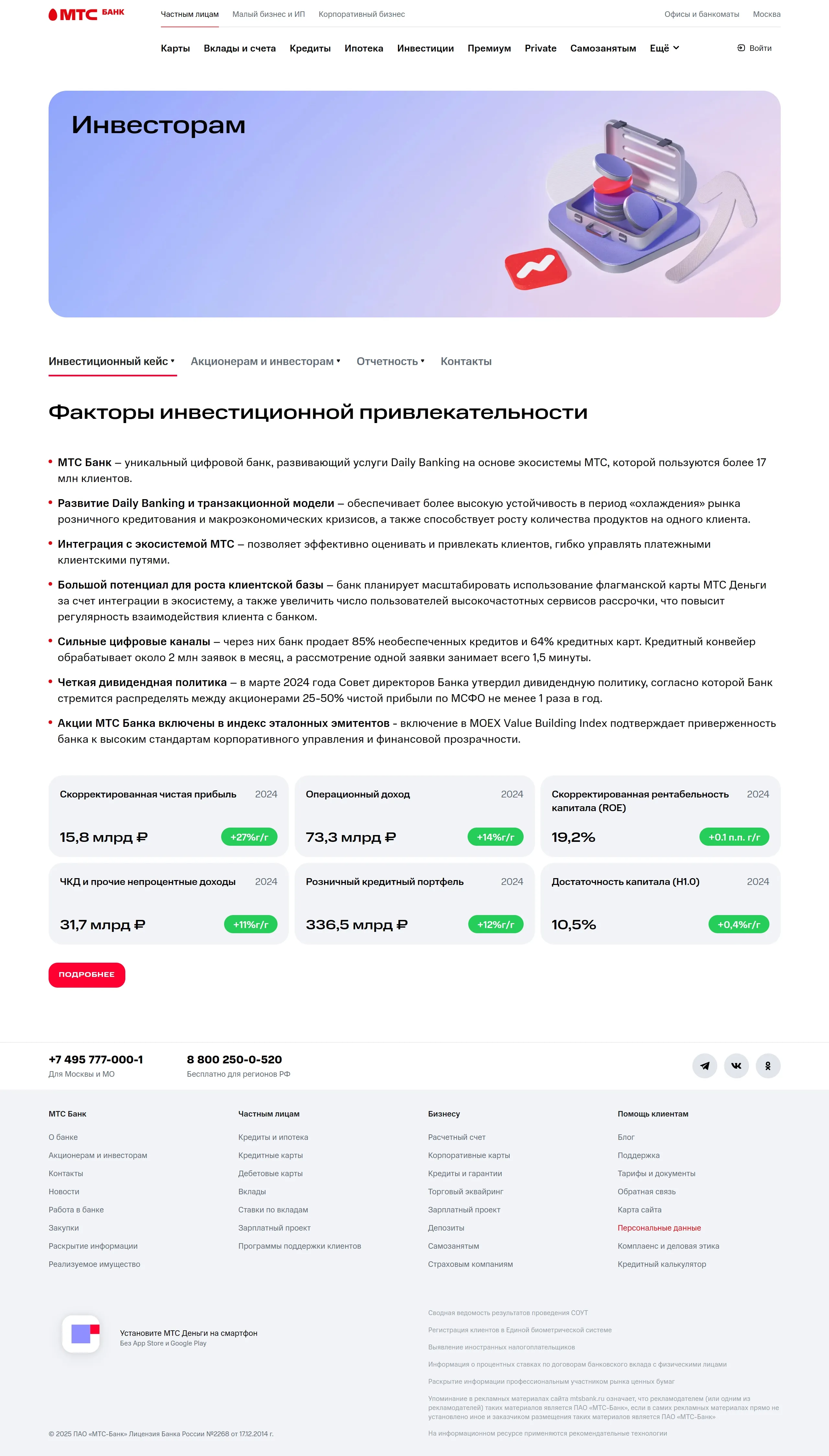 Финансовая организация, предлагающая низкие ставки по кредитам и высокие кэшбэки по картам, а также разнообразные услуги для частных лиц и бизнеса.