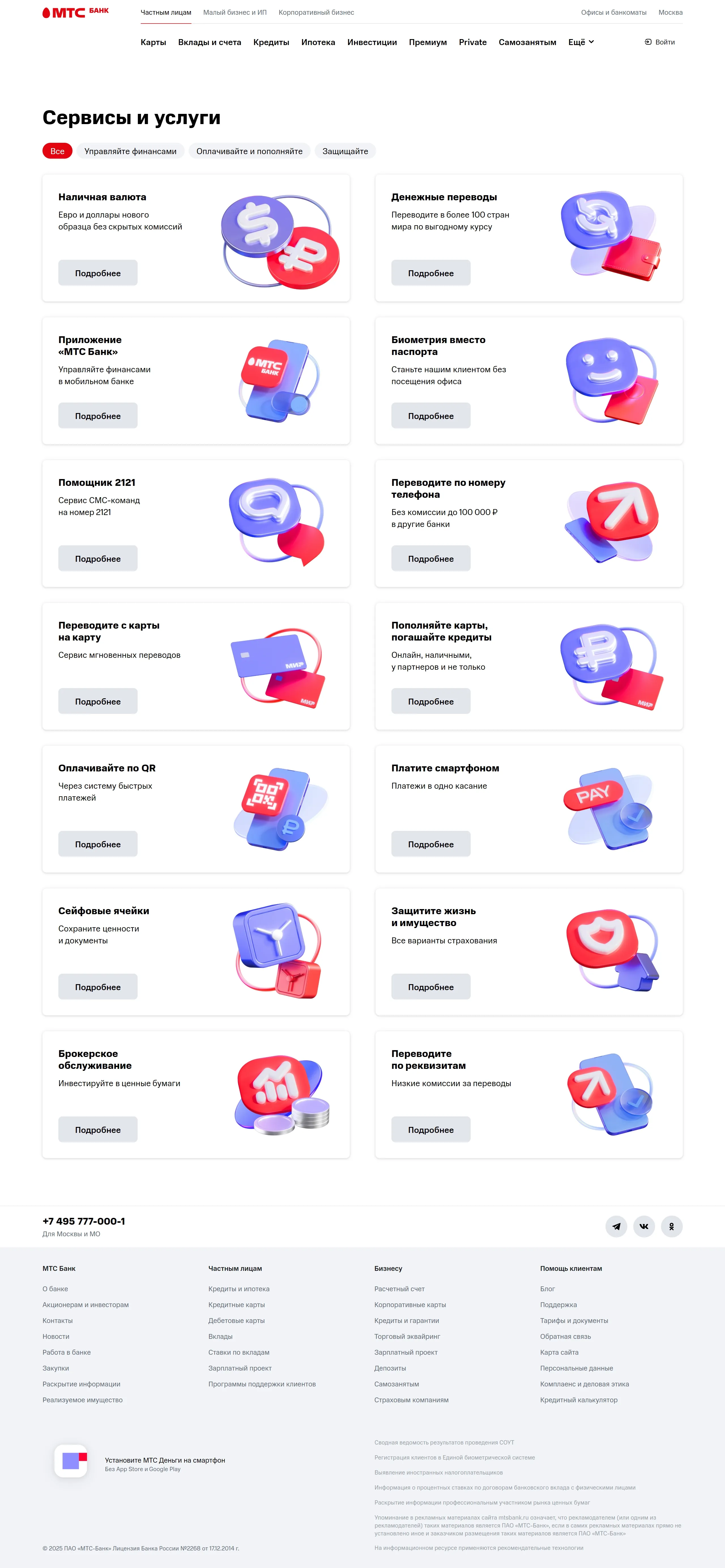 МТС Банк предлагает низкие ставки по кредитам и выгодные условия по кредитным картам, включая высокий кэшбэк. Банк также предоставляет широкий спектр финансовых услуг, таких как вклады, ипотека и инвестиции.