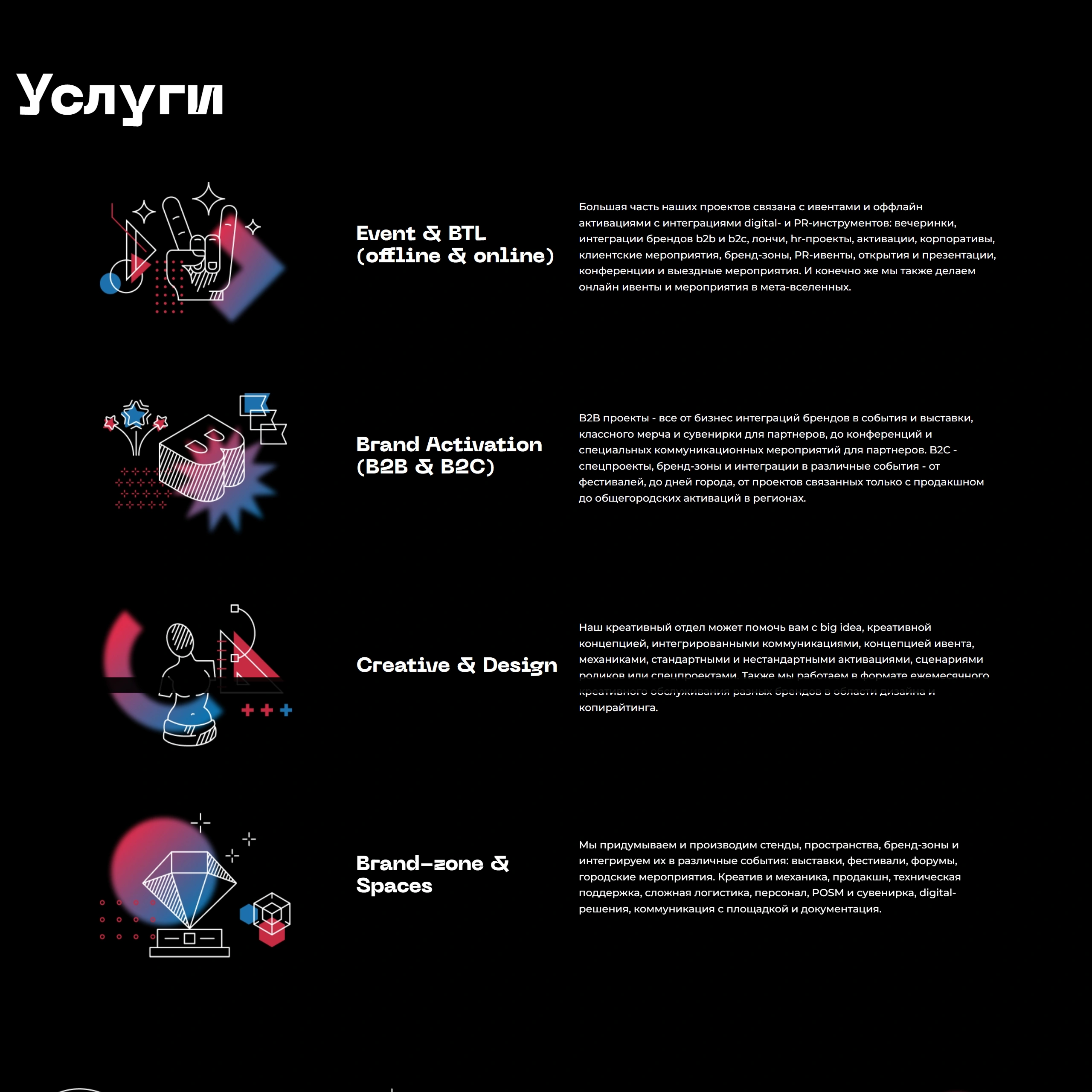 Агентство, предоставляющее услуги в области мероприятий и коммуникаций, работая как на российском, так и на международном рынке. Специализируется на организации различных типов событий, включая корпоративные мероприятия и фестивали.
