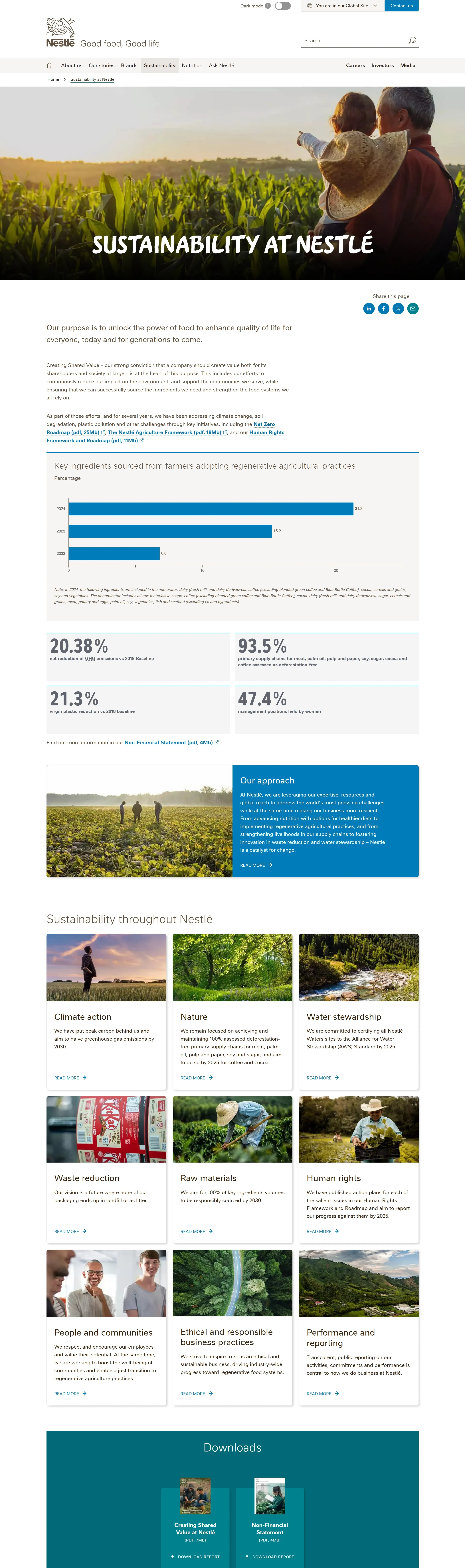 Страница о компании Nestlé, тематика — Еда и напитки, цвета — Белый, Серый, стиль — Корпоративный, типографика — Без засечек