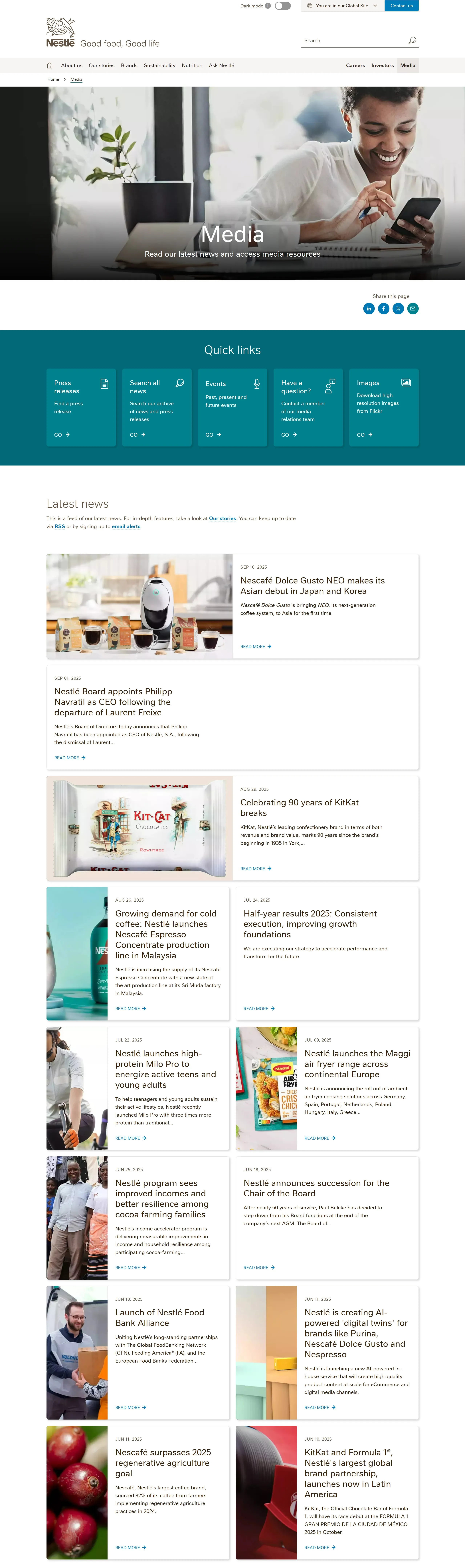 Новости Nestlé, тематика — Еда и напитки, цвета — Белый, Серый, стиль — Корпоративный, типографика — Без засечек