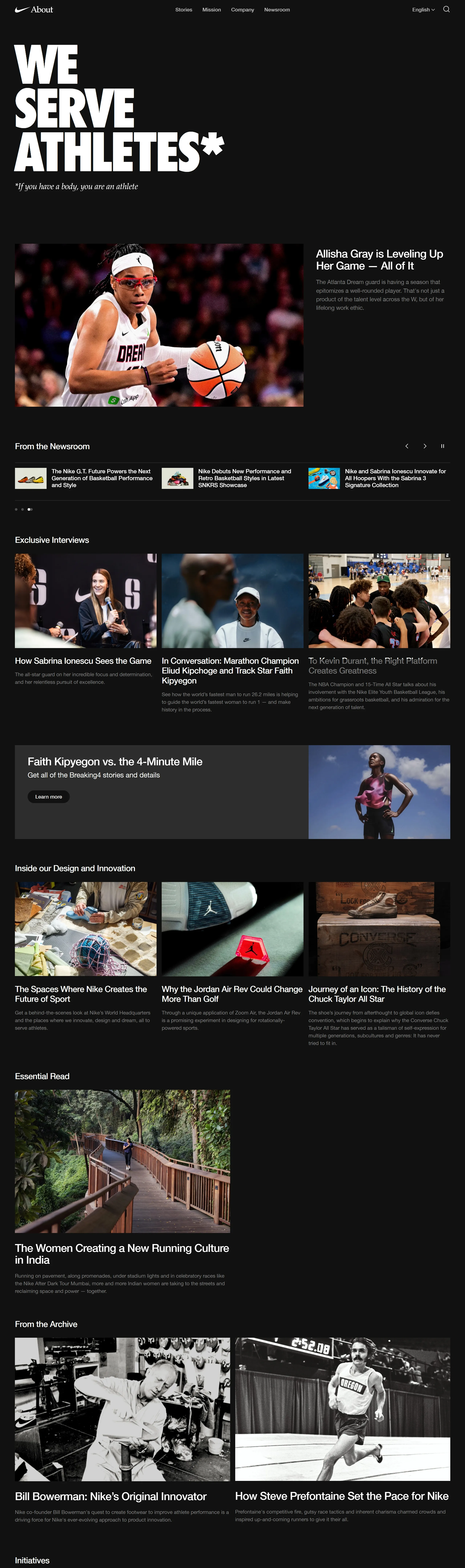 Страница о компании Nike, тематика — Здоровье и фитнес, цвета — Черный, Серый, стиль — Корпоративный, Минимализм, типографика — Без засечек