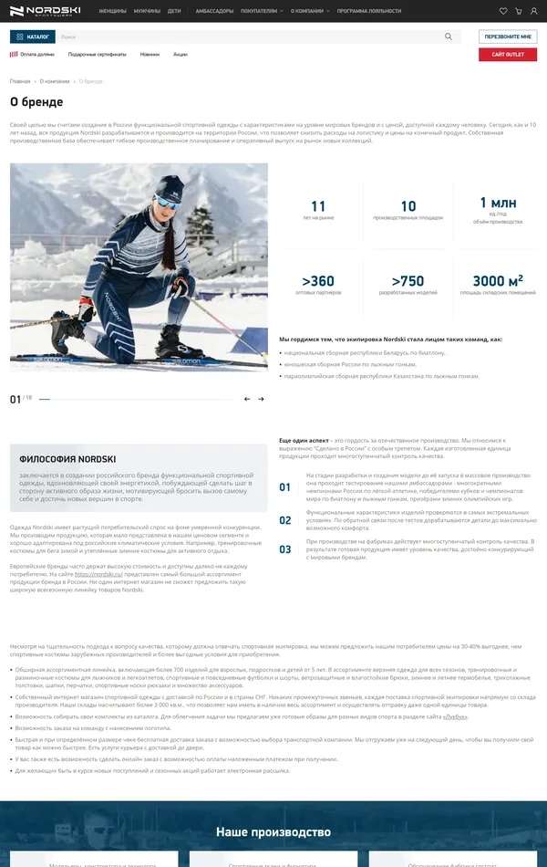 Страница о компании Nordski, тематика — Интернет-магазин, Одежда, цвета — Белый, Серый, стиль — Корпоративный, Минимализм, типографика — Без засечек