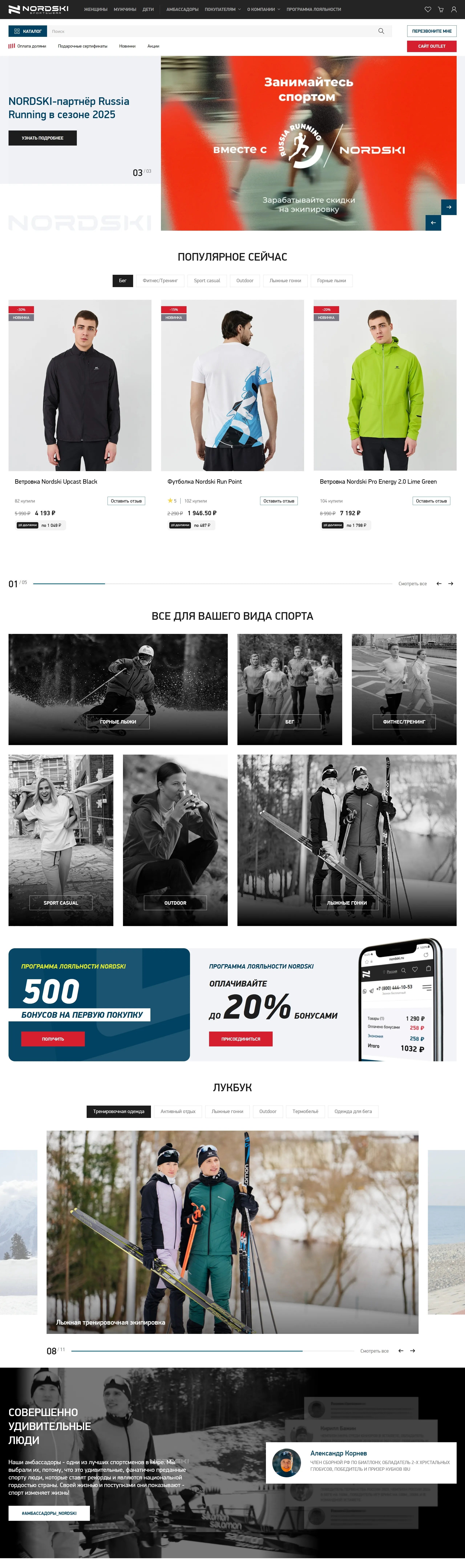 Главная Nordski, тематика — Интернет-магазин, Одежда, цвета — Белый, Черный, Серый, стиль — Корпоративный, типографика — Без засечек