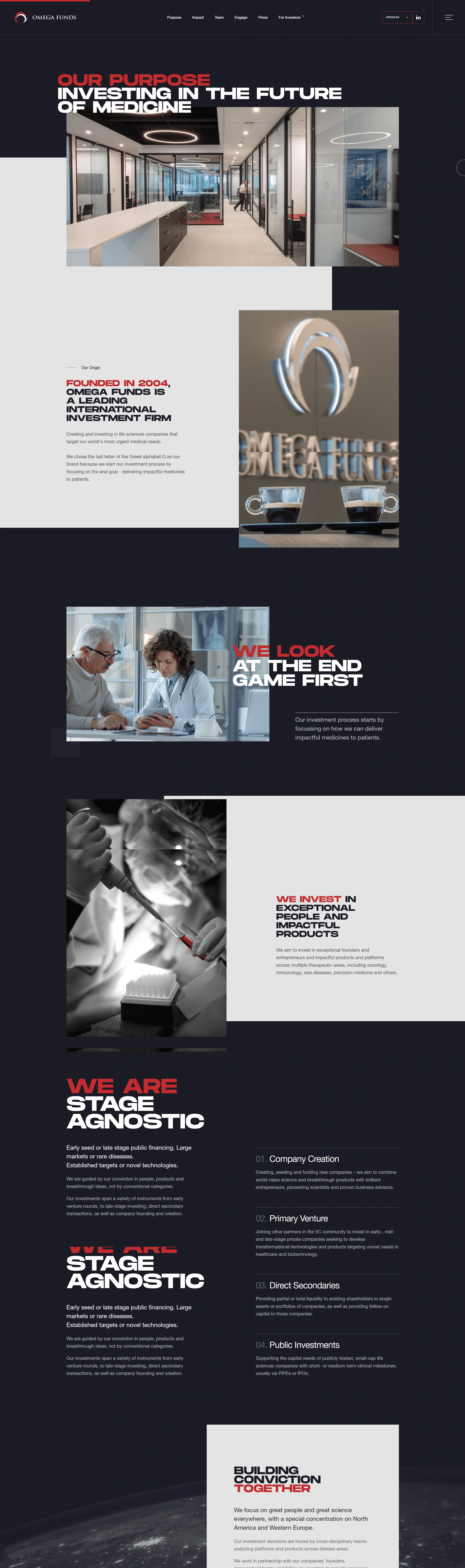 Секция «Первый экран» с сайта https://omegafunds.impression.studio/, тематика — Финансы, цвета — Черный, Серый, стиль — Корпоративный, Минимализм, типографика — Без засечек, Декоративные