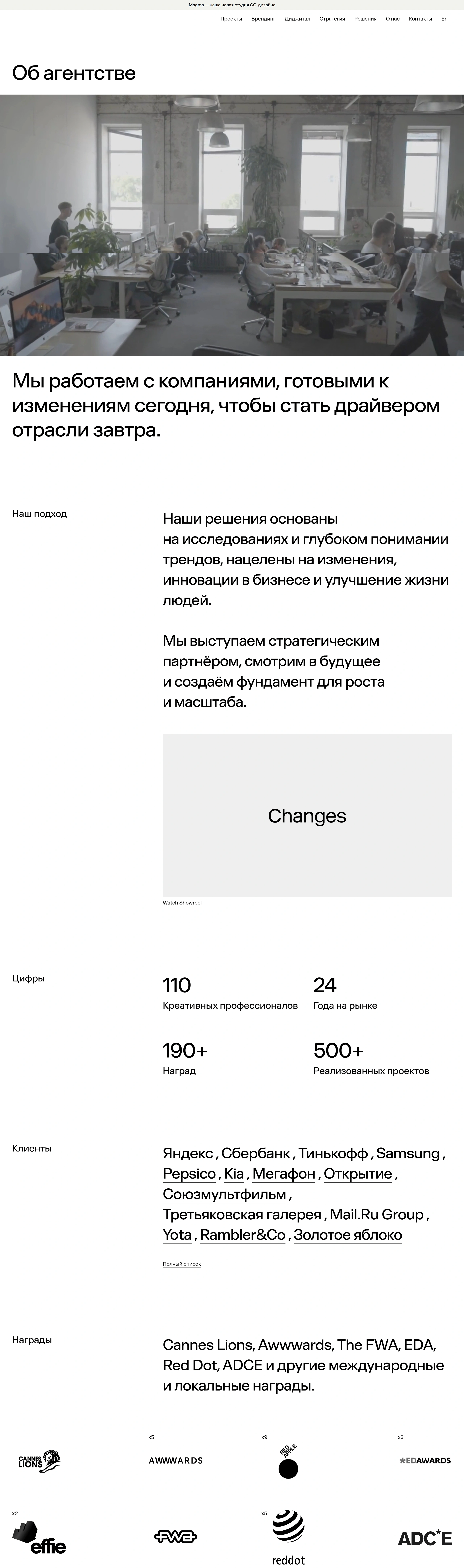 Агентство, предлагающее стратегии, брендинг и цифровые решения для компаний, готовых к изменениям. Оно гордится работой с лидерами рынка.
