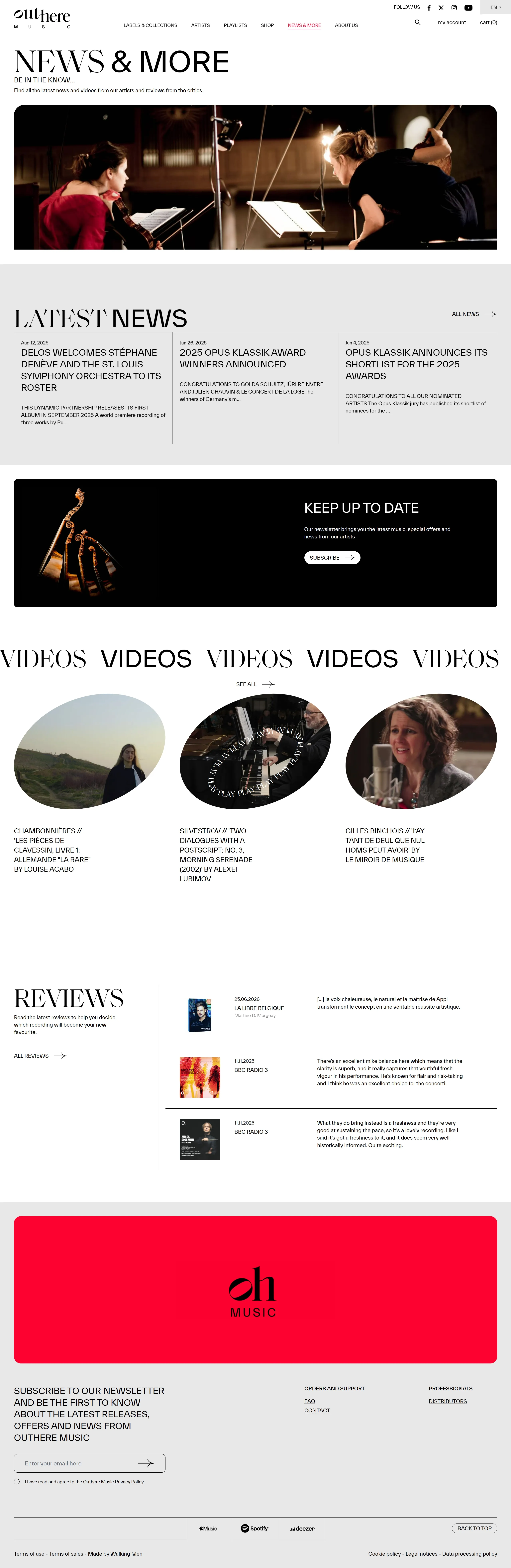 Страница о компании Outhere Music, тематика — Музыка, цвета — Белый, Черный, Серый, Красный, стиль — Корпоративный, типографика — Без засечек