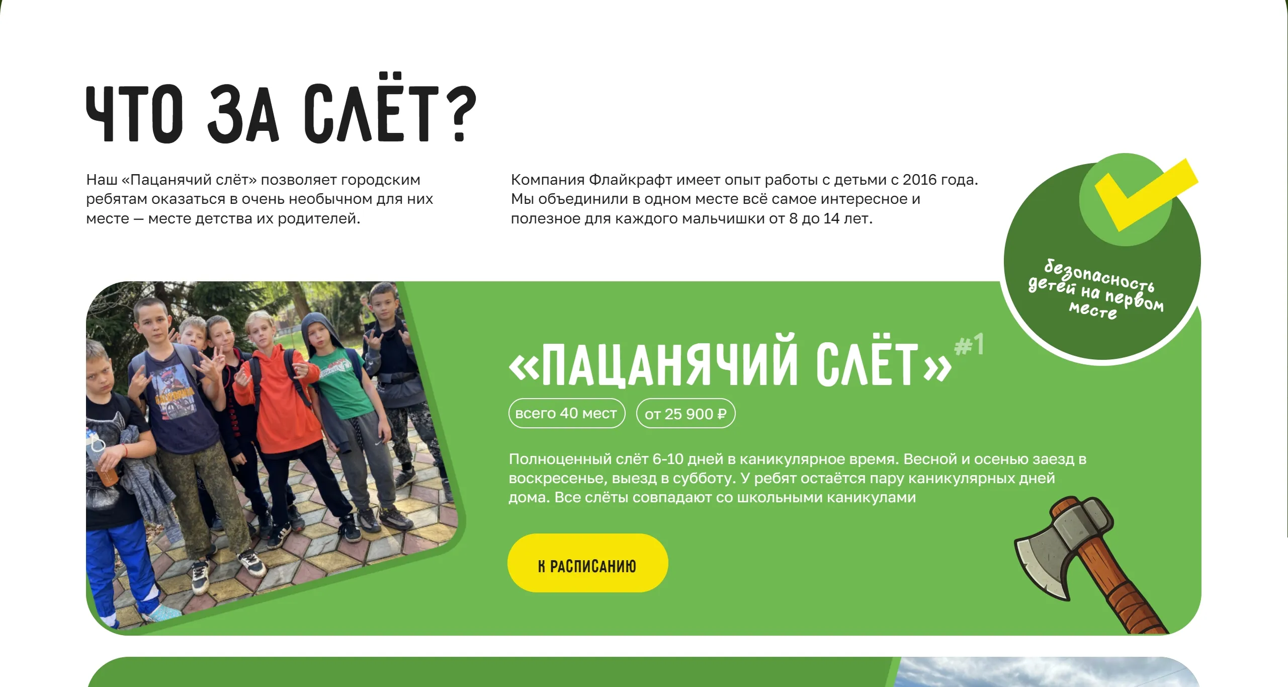 Компания предлагает организовать слёты для мальчиков от 8 до 14 лет, где дети могут заниматься активными играми, заниматься рыбалкой и развивать навыки совместного преодоления трудностей.