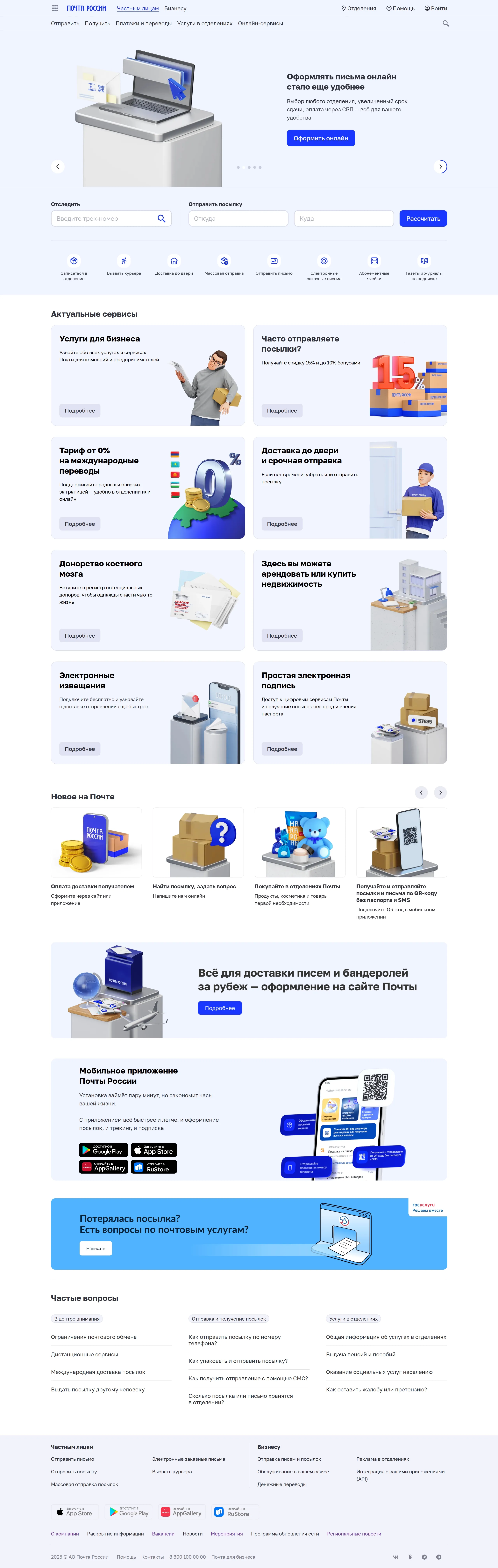 Компания предоставляет услуги по доставке по России и всему миру как для частных клиентов, так и для бизнеса, включая оформление и отслеживание посылок и писем онлайн. Также доступна информация о почтовых отделениях, услугах и тарифах.