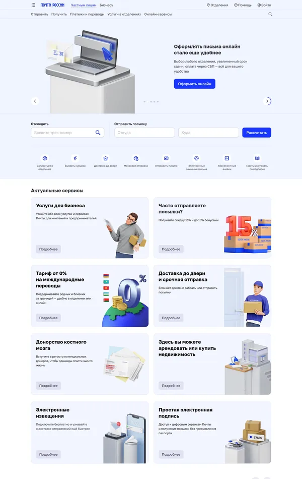Компания предоставляет услуги доставки по России и миру для частных клиентов и бизнеса, включая оформление и онлайн-отслеживание посылок и писем. Также доступна информация о почтовых отделениях, услугах и тарифах.