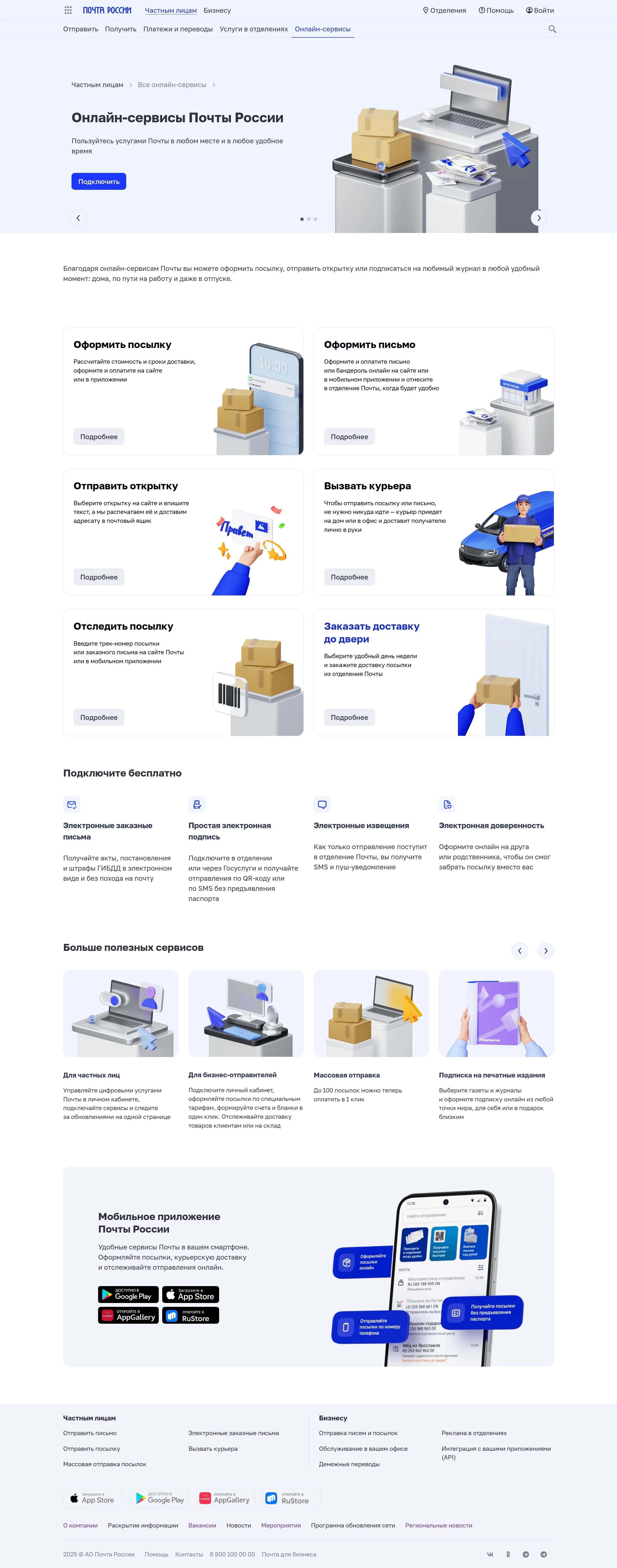 Доставка по России и миру для частных клиентов и бизнеса, включая оформление и отслеживание посылок и писем онлайн, а также информацию о почтовых отделениях, услугах и тарифах.