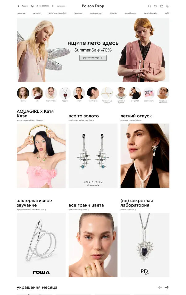 Секция «Первый экран» с сайта https://poisondrop.ru/, тематика — Интернет-магазин, цвета — Белый, Серый, стиль — Минимализм, типографика — Без засечек