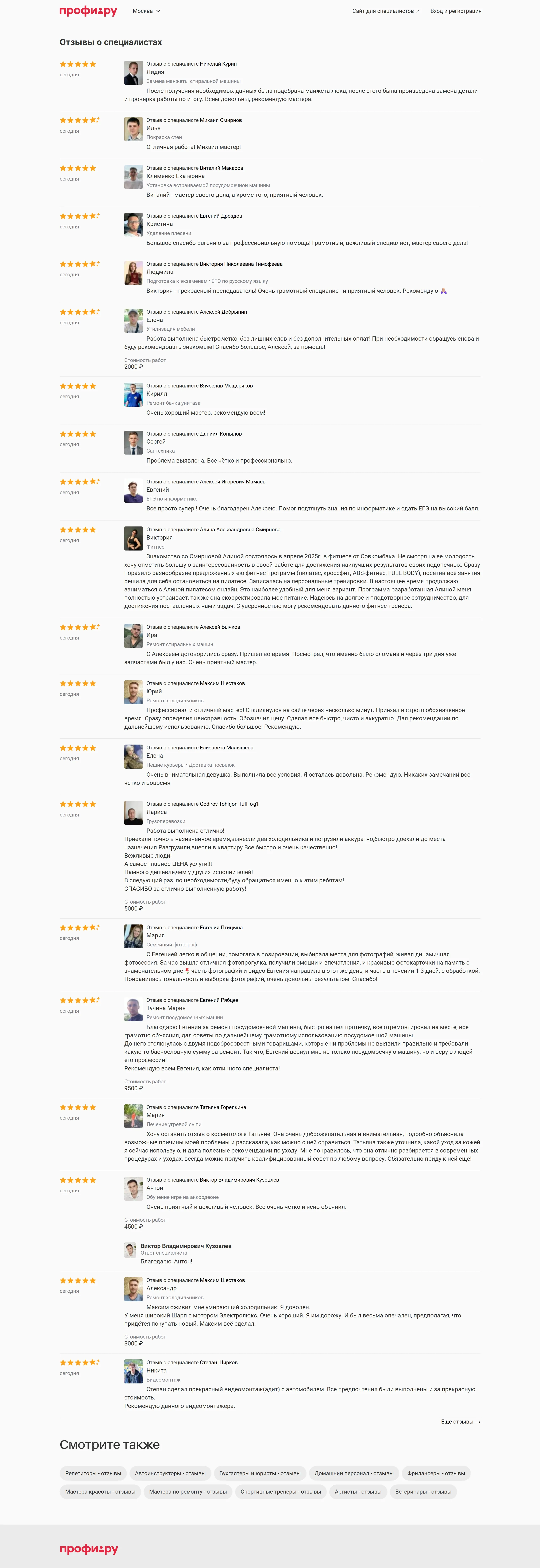 Сервис поиска специалистов, предлагающий услуги более 3 000 000 профессионалов в Москве, включая мастеров, репетиторов и артистов. Платформа позволяет клиентам сравнивать цены и выбирать проверенных специалистов на основе отзывов.