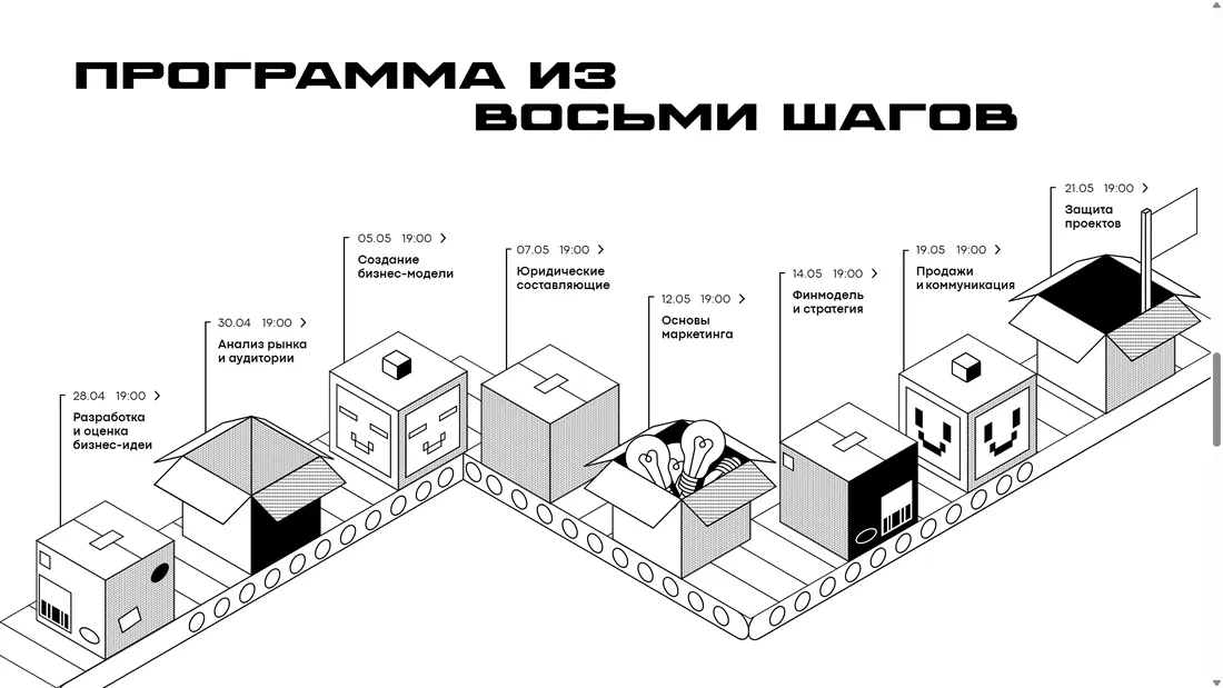 Проект, предлагающий симулятор бизнеса, который позволяет участникам разработать собственный бизнес-план, обмениваться контактами и получать советы от опытных бизнесменов. Мероприятия предназначены для лиц от 14 до 35 лет и охватывают различные аспекты запуска и управления бизнесом.