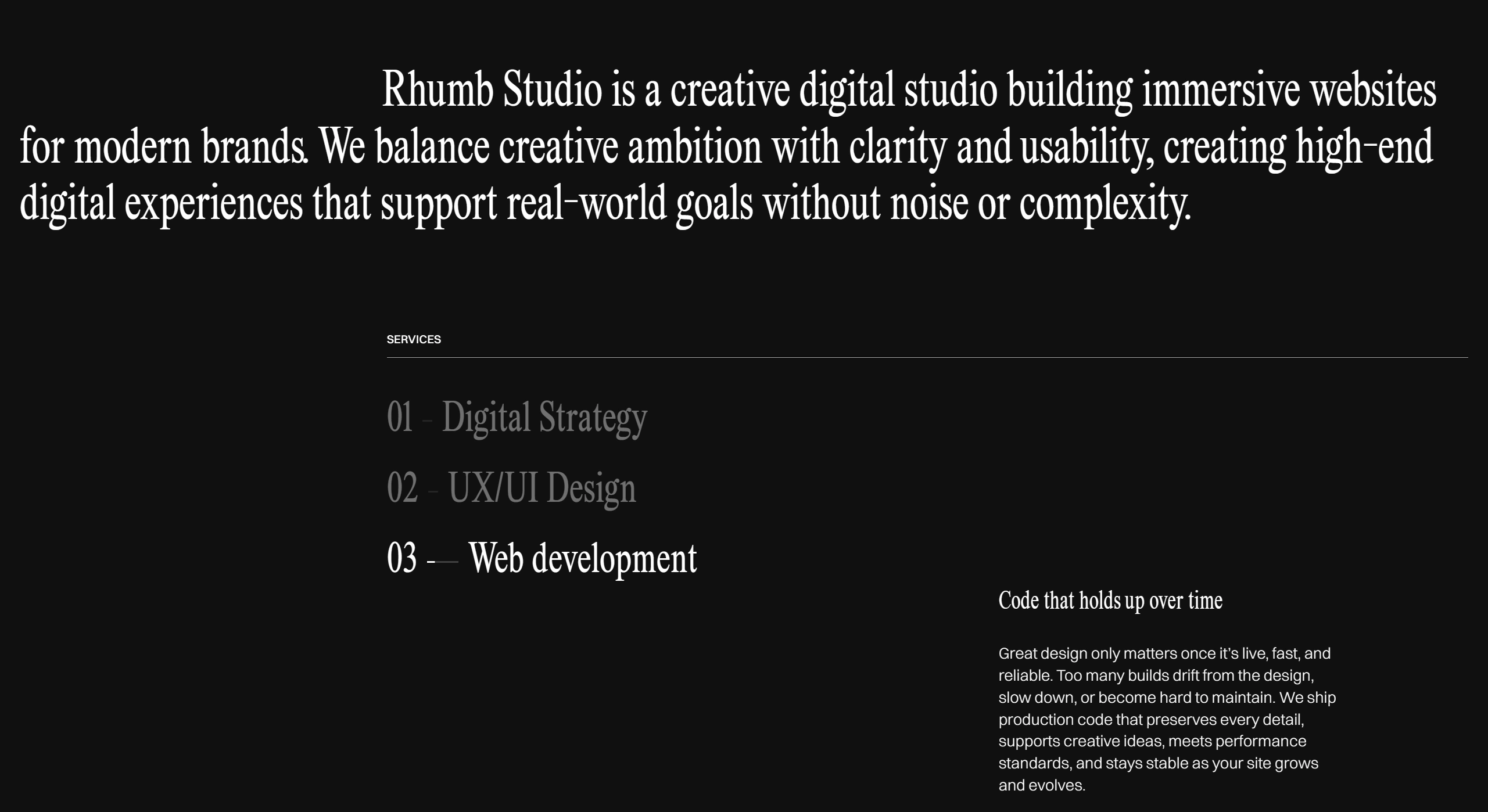 Rhumb Studio is a creative digital studio that specializes in building immersive websites for modern brands, focusing on clarity and usability to support real-world goals. They combine creative ambition with technical expertise to create high-end digital experiences.