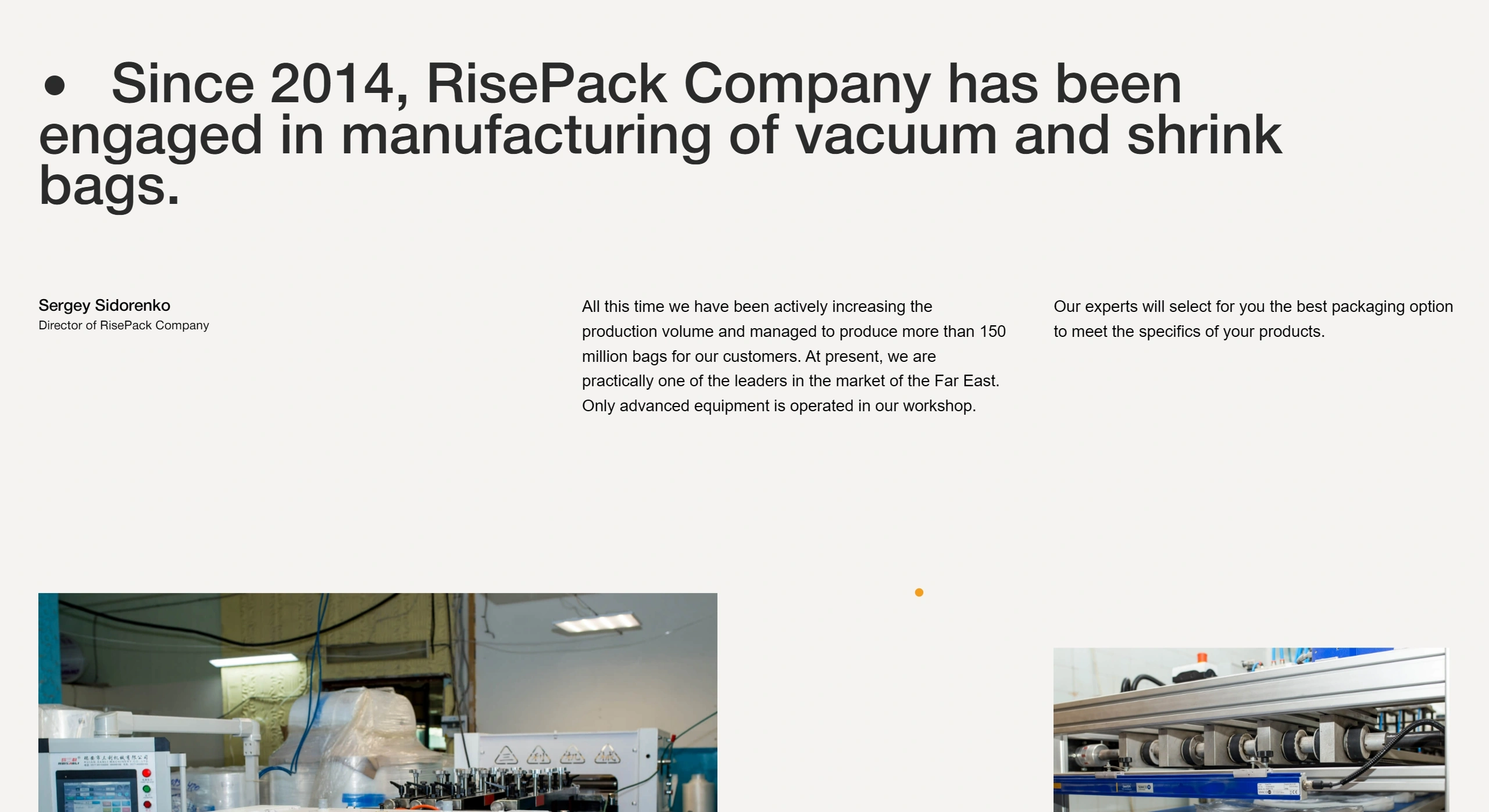 Компания занимается производством вакуумных и термоусадочных пакетов для пищевых продуктов с 2014 года и предлагает продукцию высокого качества. В производстве используется сырьё как российского, так и немецкого производства.
