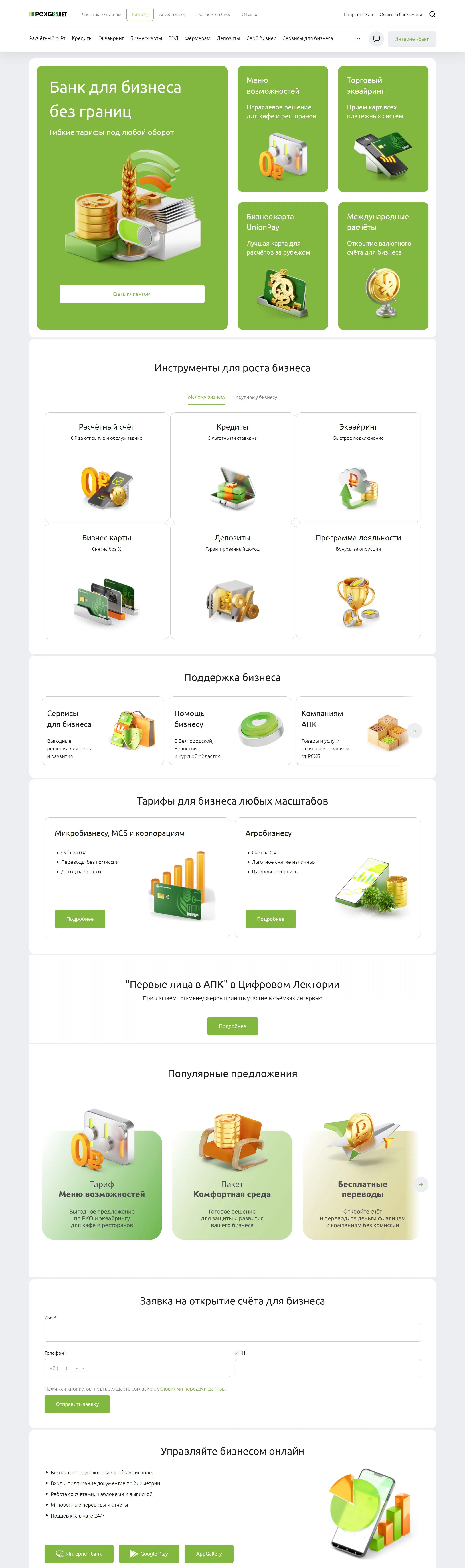 Официальный сайт Российской сельскохозяйственного банка, предлагающего широкий спектр банковских услуг для физических и юридических лиц, включая кредиты, карты и вклады.