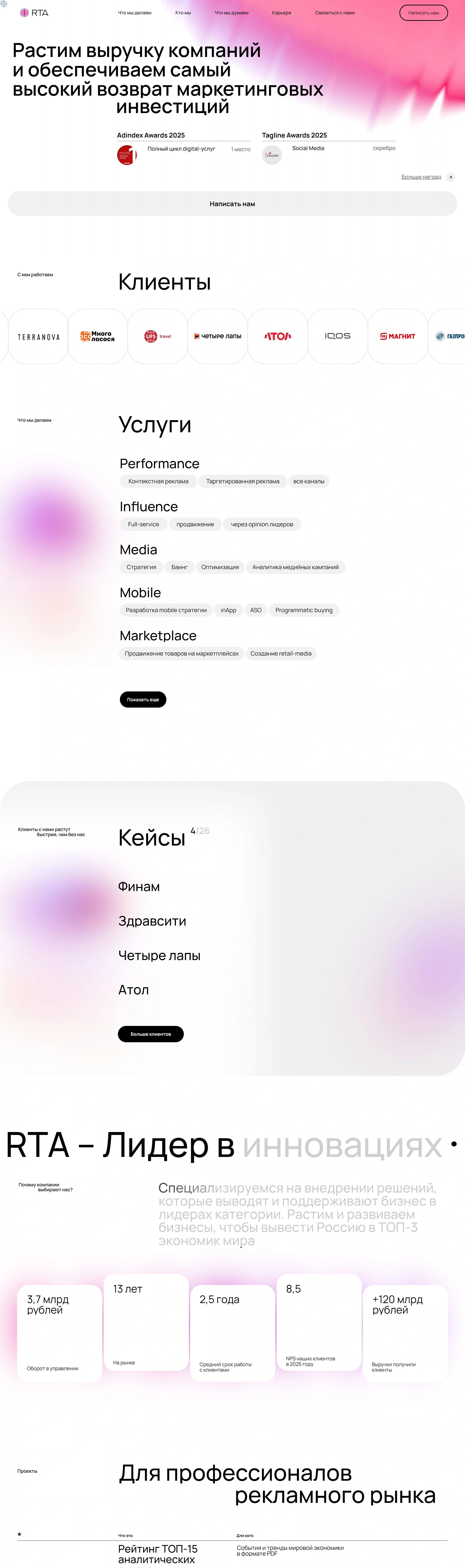 Агентство digital-маркетинга, которое помогает компаниям расти в выручке и обеспечивает высокий возврат инвестиций в маркетинг. Предлагает полный цикл digital-услуг, включая таргетированную рекламу и медиазакупки.