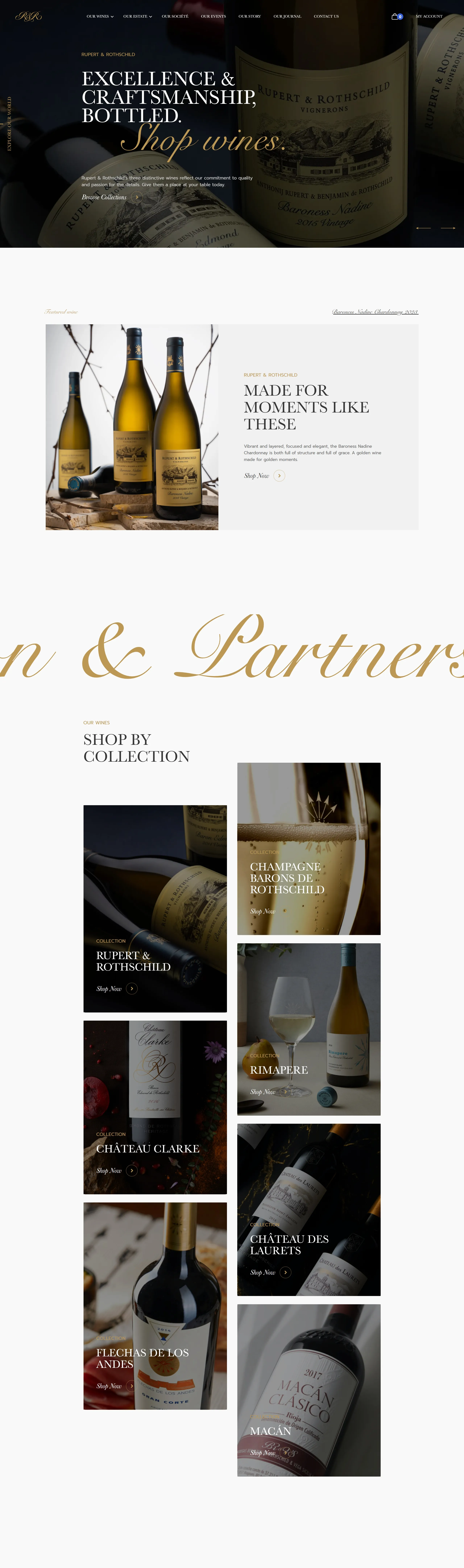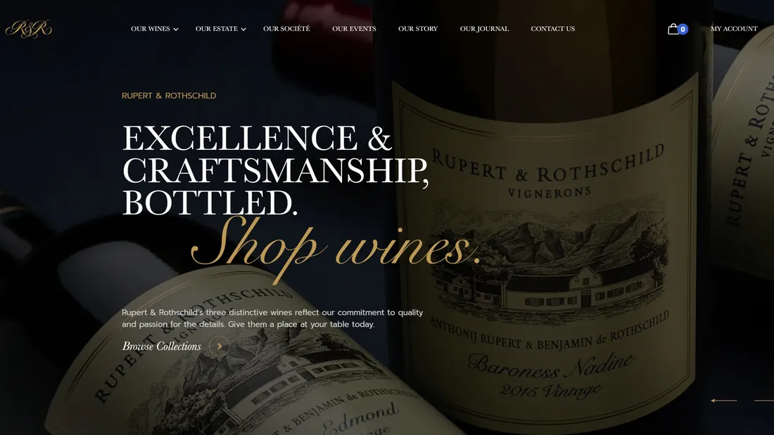 Секция «Первый экран» с сайта https://shop.rupert-rothschildvignerons.com/, тематика — Еда и напитки, цвета — Черный, стиль — Классический, Корпоративный, типографика — С засечками, Рукописные